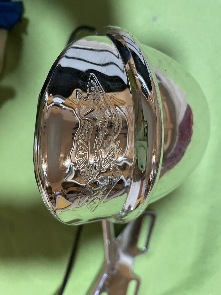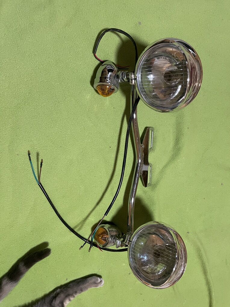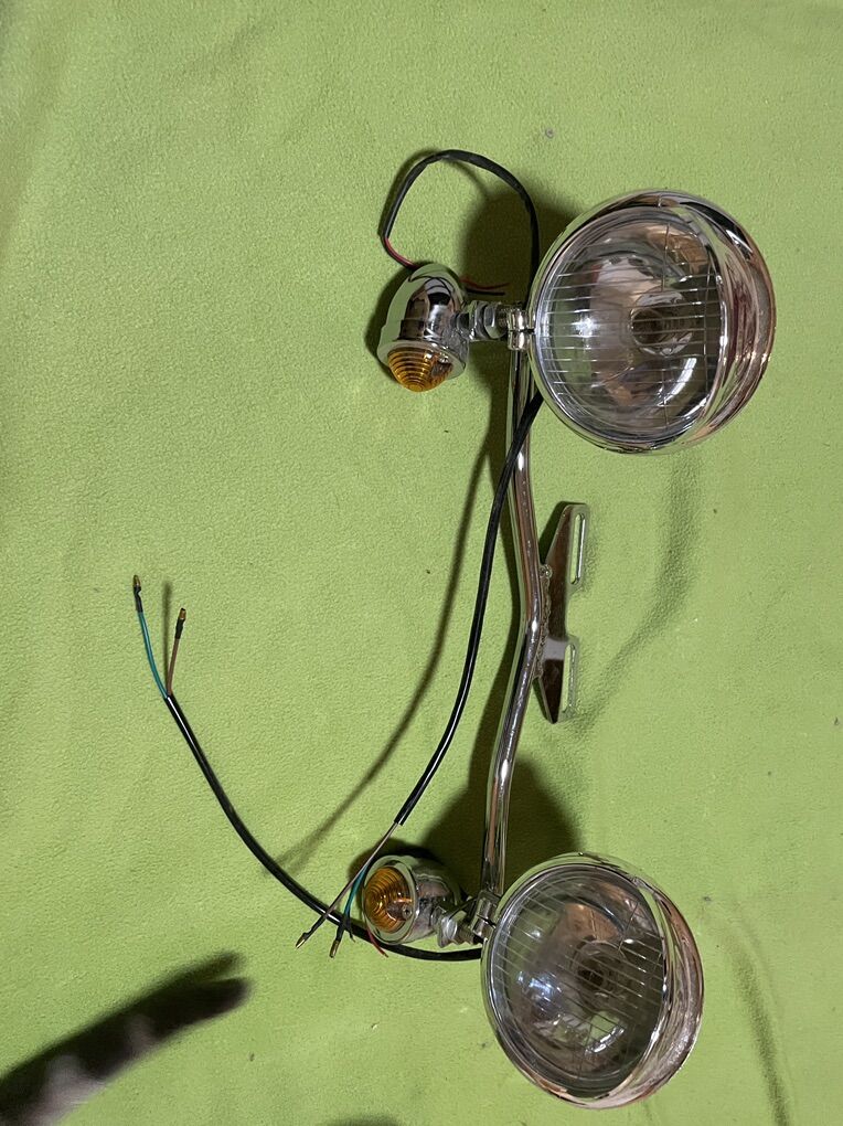 Lights mounted to a chrome bar to enable bolting to the front of a motorcycle.