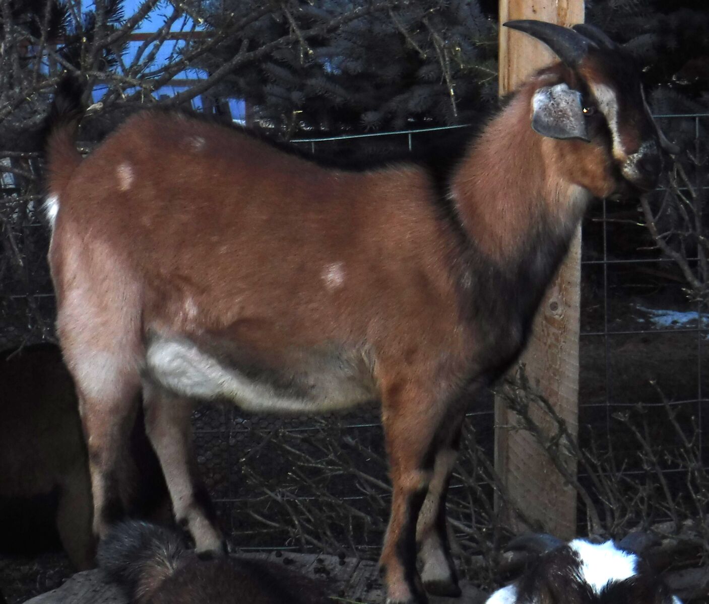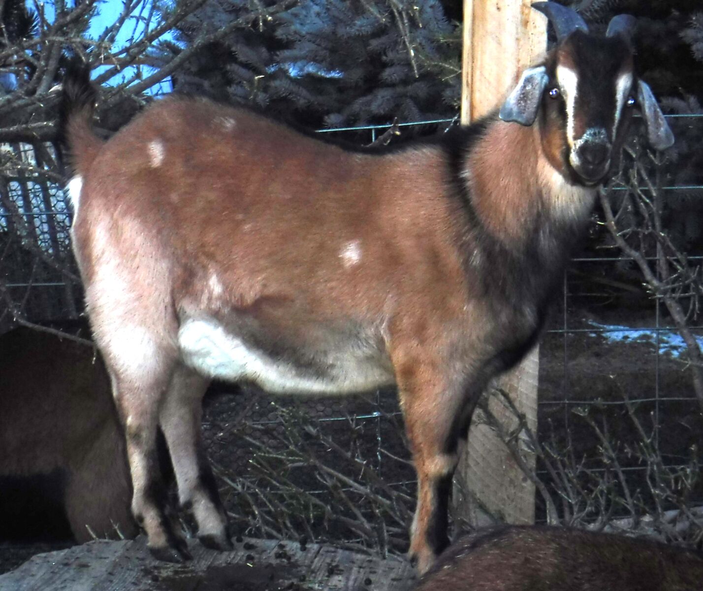 This young buck was born July 11, 2025. His mom is an Alpine/Nubian mix and father is a purebred Nubian. He is a healthy, and spunky young buck. Beautiful coloring...ready to be a dad for some lucky ladies. :) Antibiotic and vaccine free.