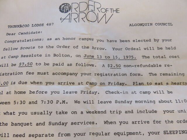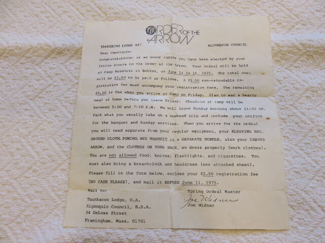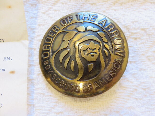 My brother received this BSA award of the "Order of the Arrow" in 1975; and as the pictures show, it is in excellent condition as is the letter from the local BSA chapter that approved it and provided instructions for its presentation to him in 1975.