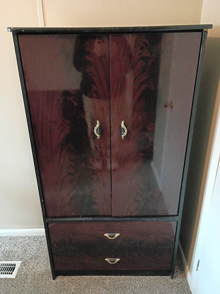 armoire, cherry color 16 x 33 x 59 2 drawers, 3 shelf's