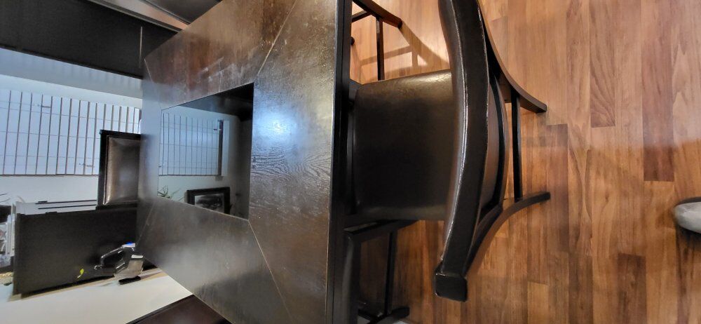 VenmoDining Table - seats 6 people - Espresso color w/fixed dark tint glass center. Dining table only. Table is in good condition.