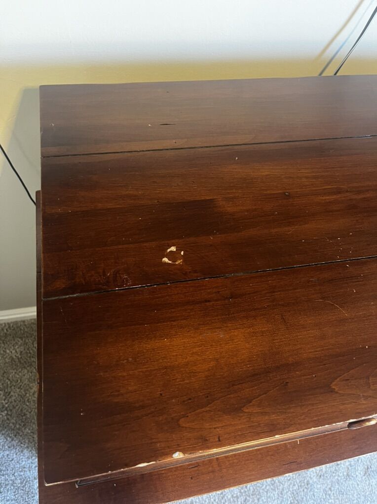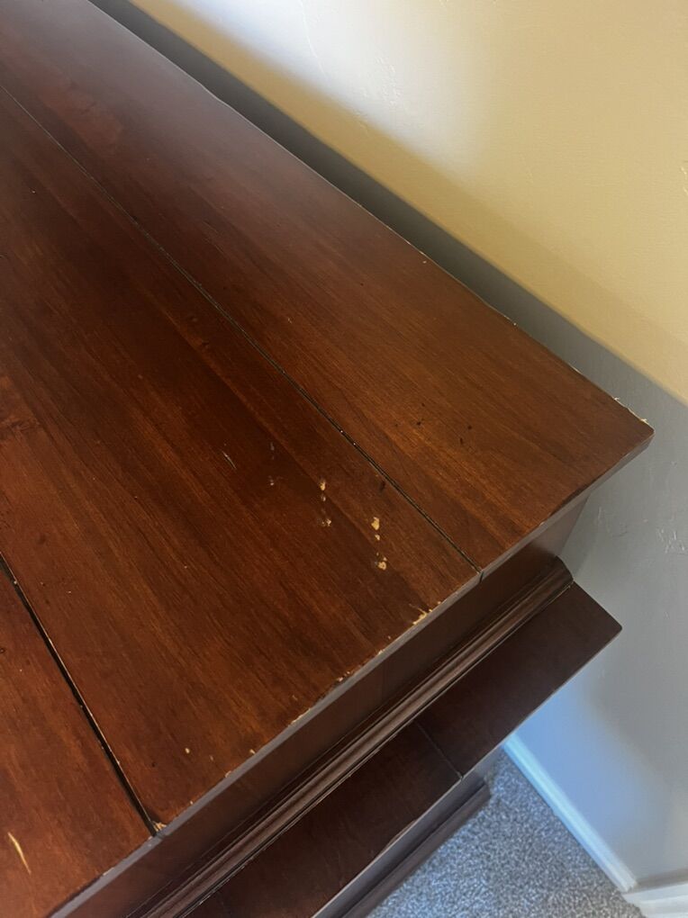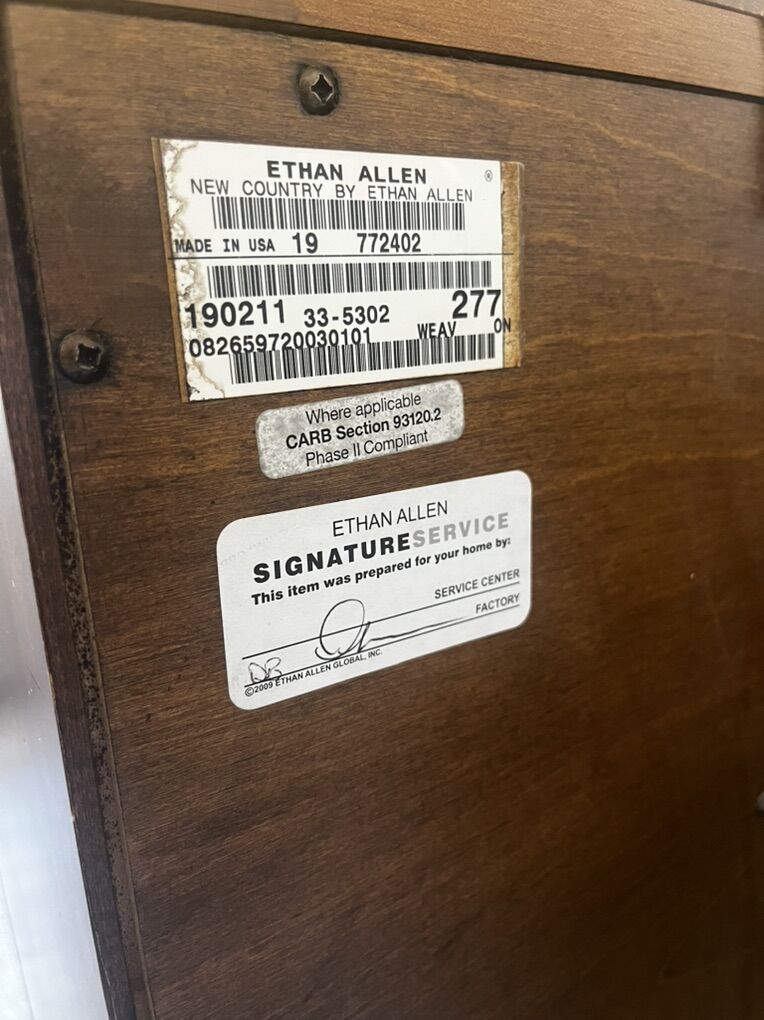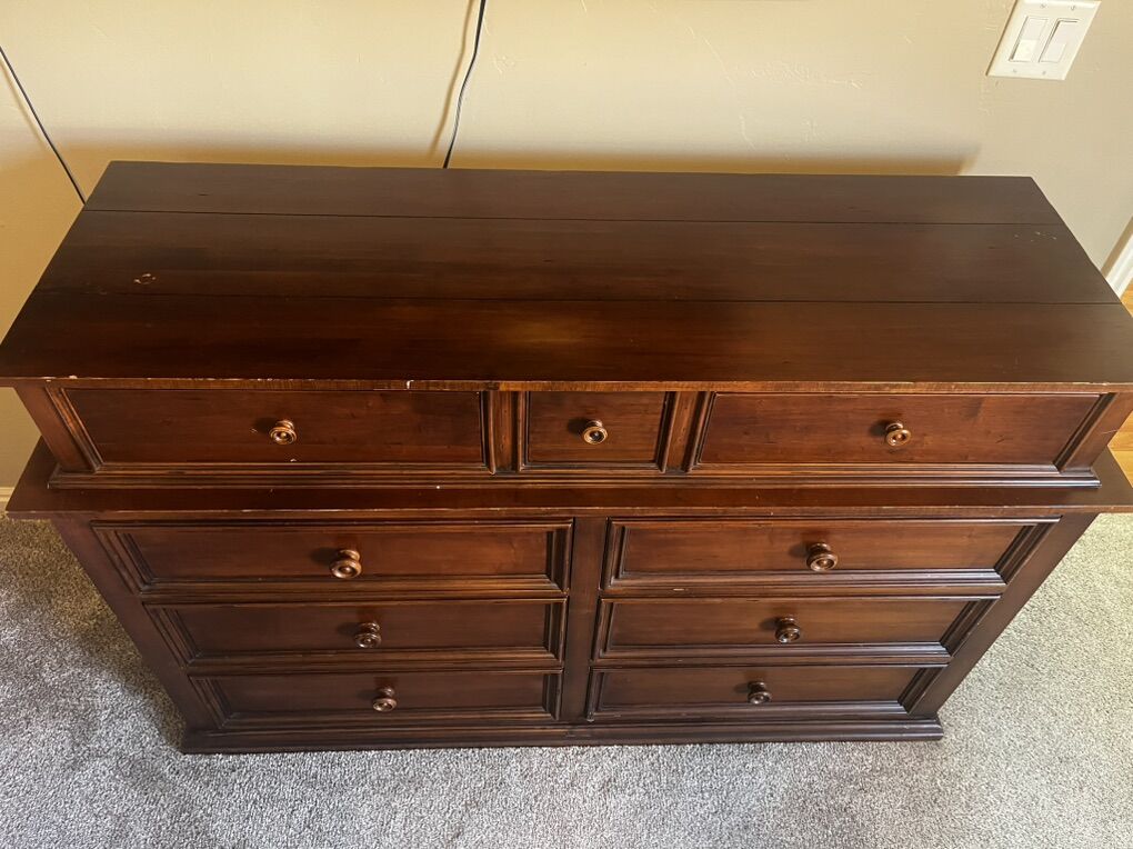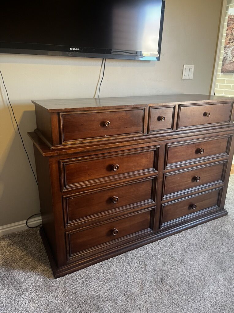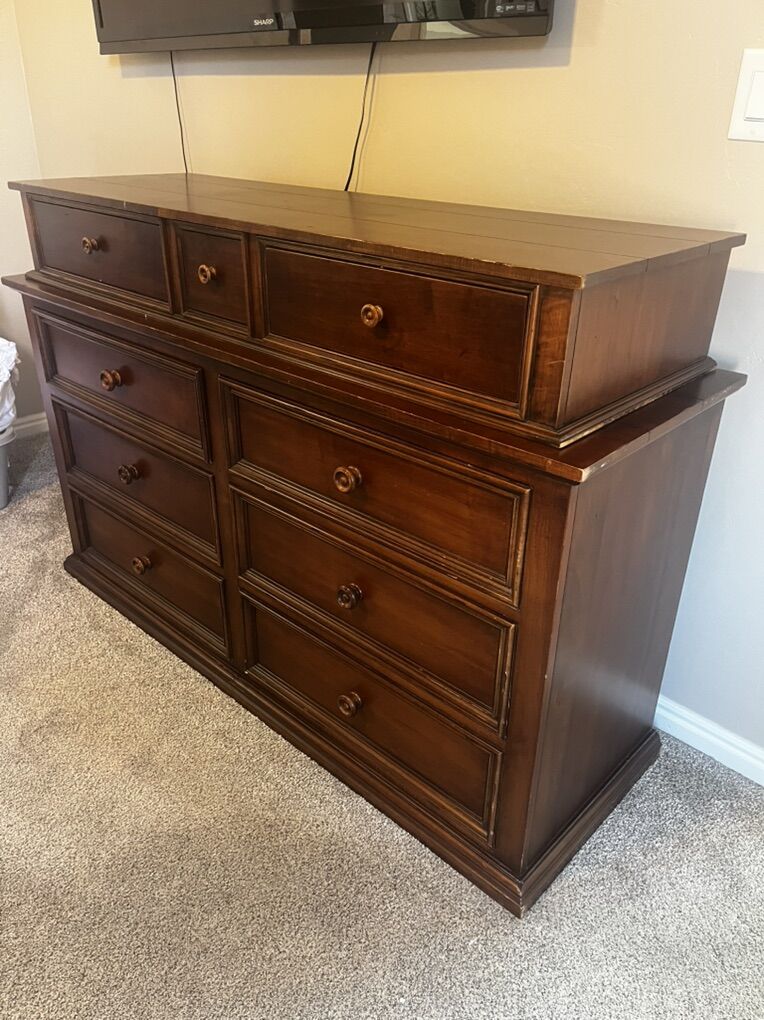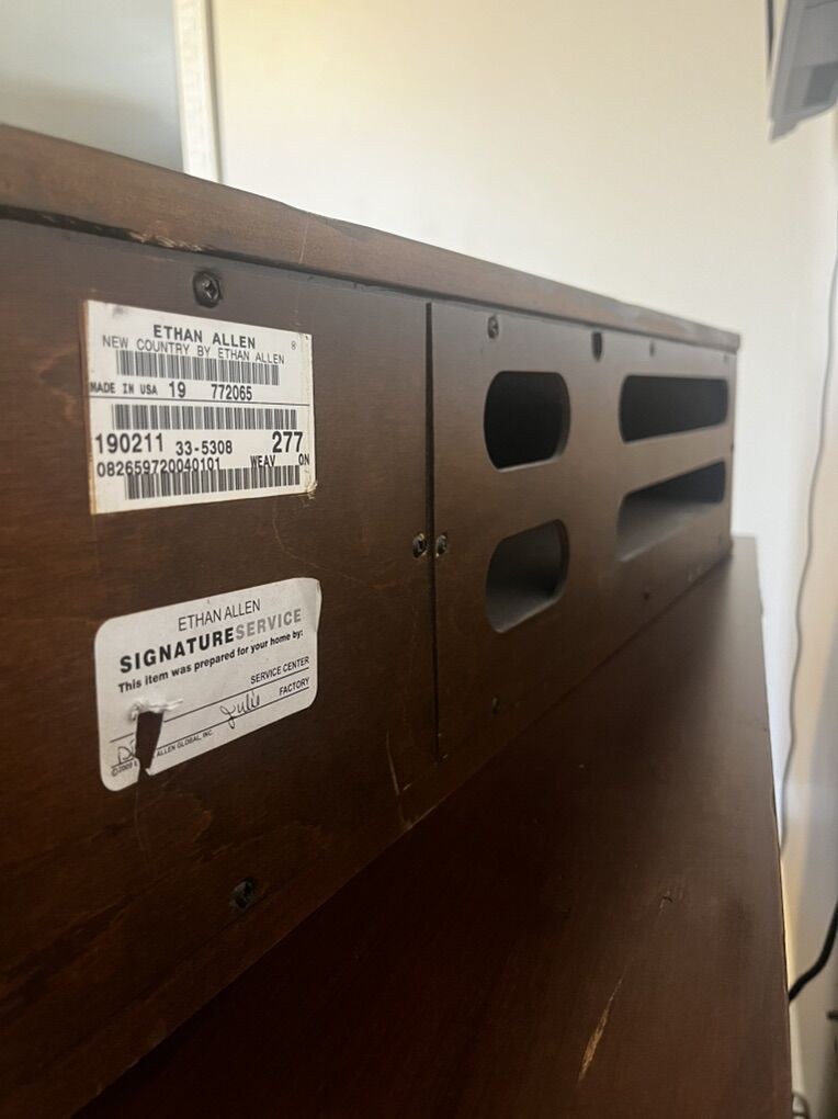 Ethan Allen dresser in good shape. 2-piece (comes apart for moving), 9 drawers, solid and very sturdy. Top piece has slots in the back for running cords/wires—great if you want to use it as a dresser or media setup. Minor normal wear from use.