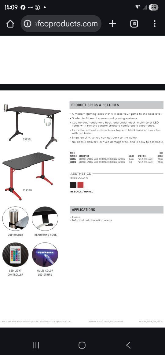 Brand new in box Safco Ultimate Computer Gaming Desk 5393 47.2”W x 23.6”D x 29.5”H Rgb lights with remote Very sturdy while being lightweight easy to assemble comes with needed tools