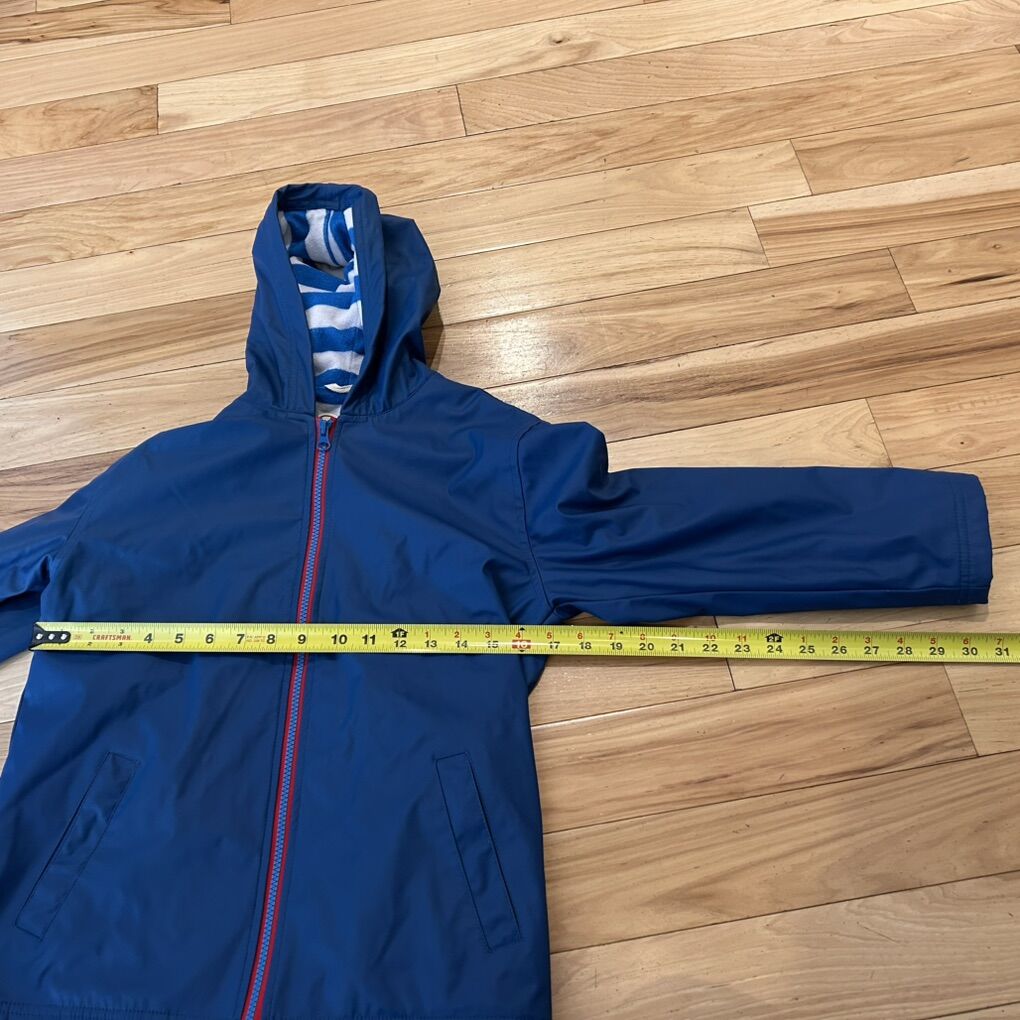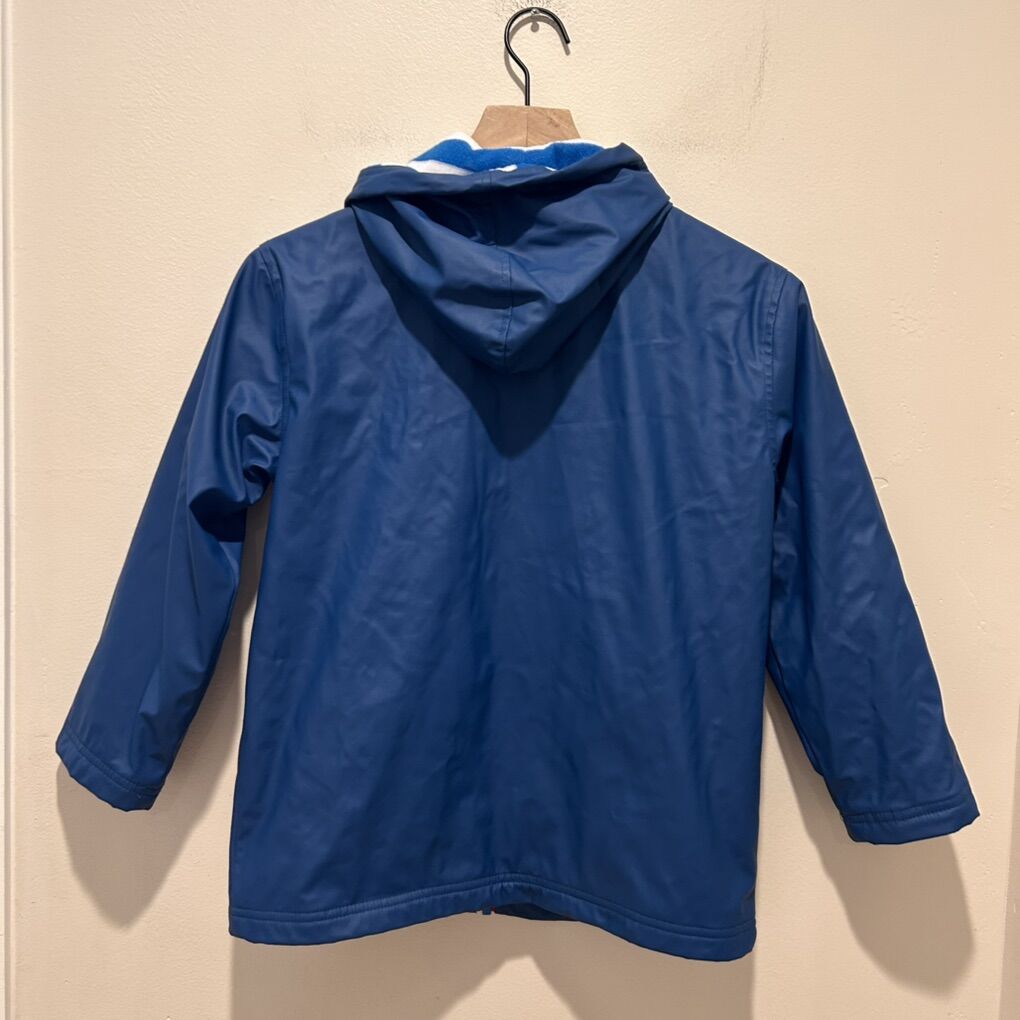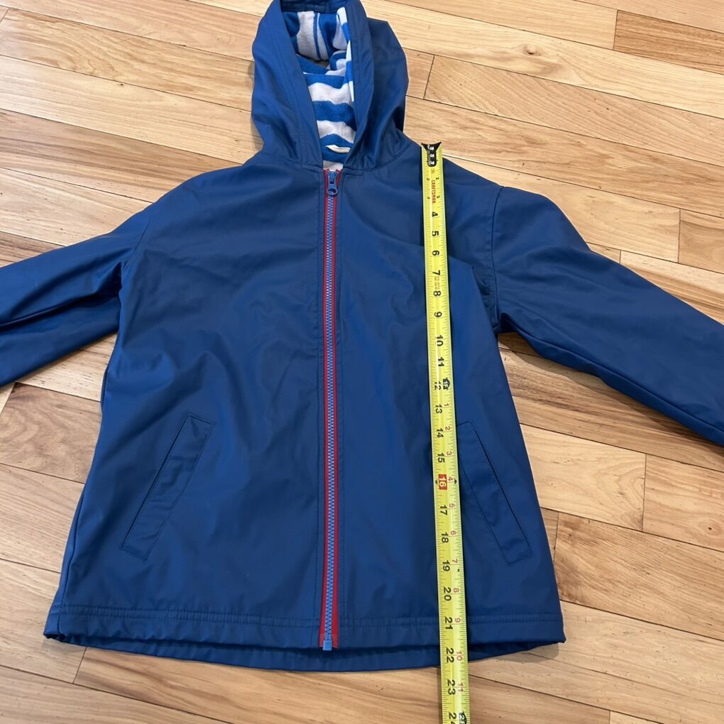 Hatley Navy Blue Hooded Waterproof Splash Raincoat Jacket - Boy’s or Girl’s Size 8 - with zippered front, warm lining and hand pockets - great condition - pre-owned.