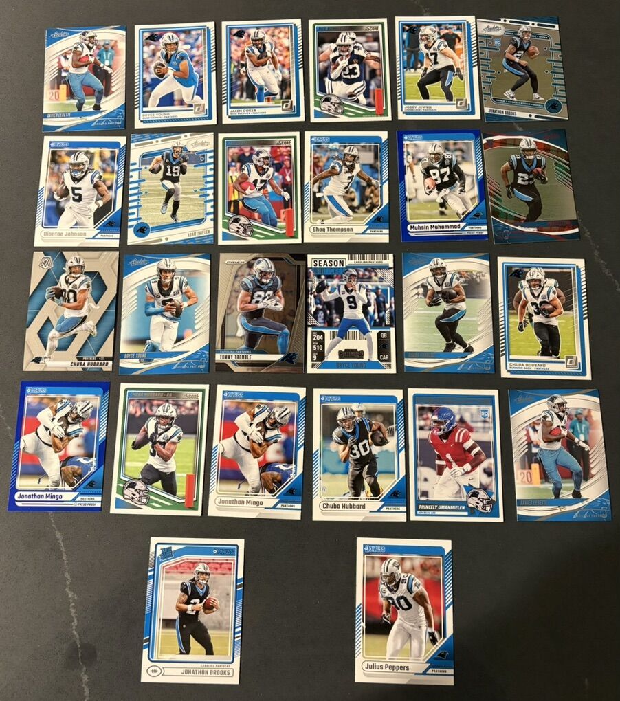 ApplePayLot of 35 Panthers football cards, with rookie cards, base, short prints, etc. Great for Panthers fans, cards are in excellent condition. Bryce Young, Tetairoa McMillan, Jonathan Brooks, Julius Peppers, Chuba Hubbard. Including a free sealed bonus pack of cards