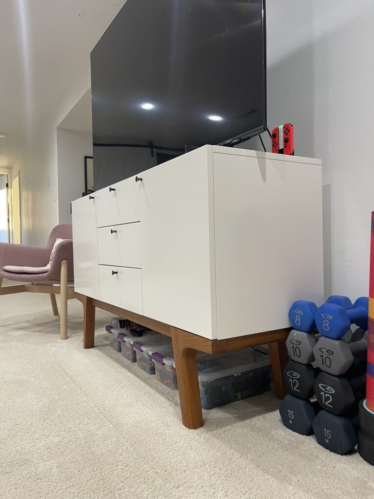VenmoHigh quality, solid wood console from West Elm, in excellent condition. There is a very small (1/16”) chip in the top of one door that has been touched up and is not noticeable. On the inside there is some staining on one of the shelves. See photos for measurements.