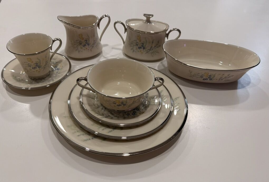 VenmoI have a set of 12 of Lenox china Cinderella with platinum trim. Dinner plate, salad plate, butter plate, soup bowl, coffee cup and saucer, sugar and cream container and serving bowl. In excellent condition. It also includes a set of mint green glasses. 12 Lenox water glasses, 12 Lenox wine glasses, 12 Lenox champagne glasses.