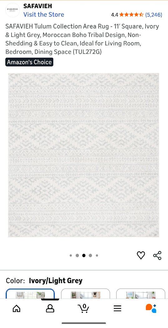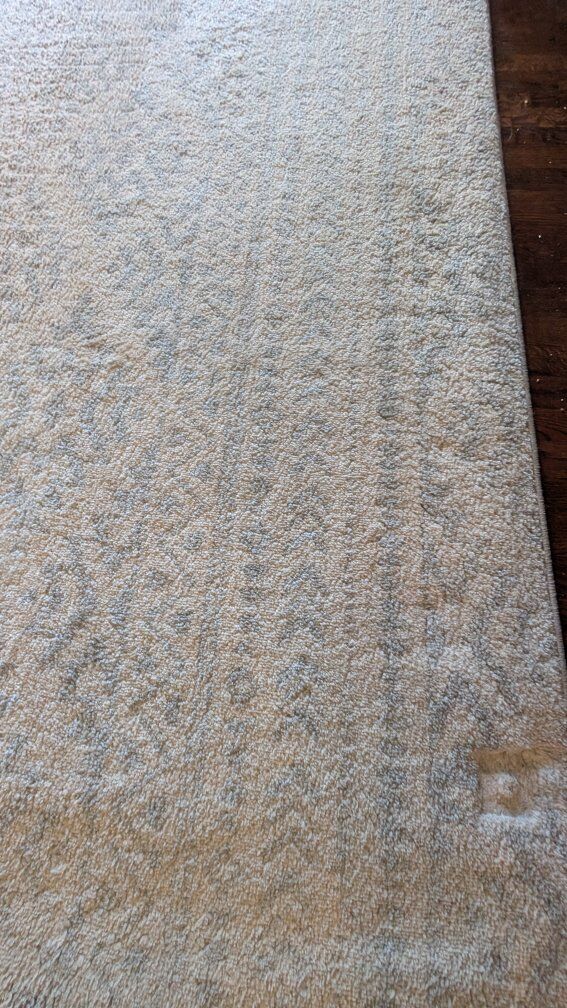 ZelleIvory and grey square (11x11) area rug in good condition. smoke and pet free home. Could use a cleaning on the small area that had more foot traffic (see pictures), Retails new at $173