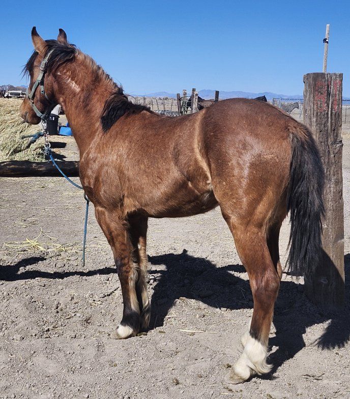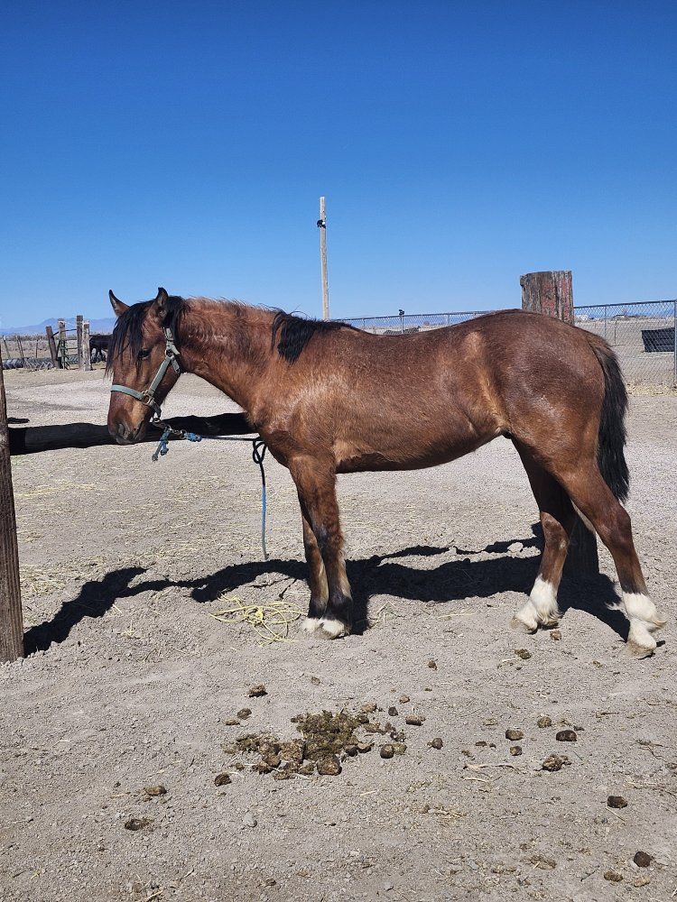 LOOK at the bone on this guy. Blm mustang Supher gelding. Nice dun gelding with all the tiger stripping.. He is a young 2 yr old looks like he was born in lsummer. He is super cute with a great confirmation. He is broke to lead, gives to pressure , Stands tied like a gentlemann. He is straight and correct has 4 white socks. He is going to make a nice gelding. No BLM paper work needed. message for more info