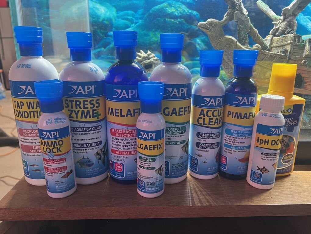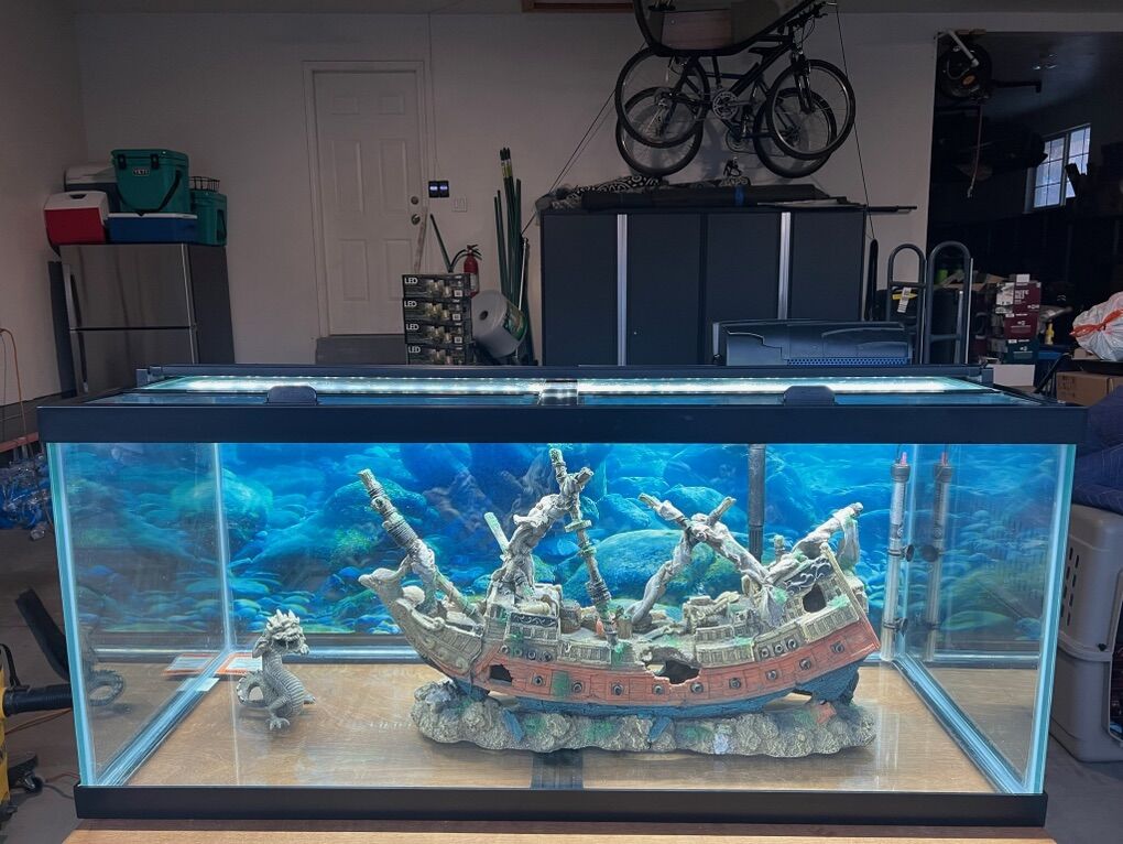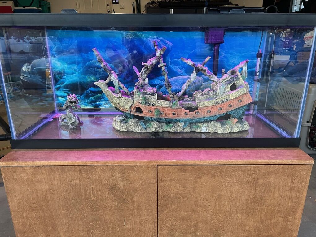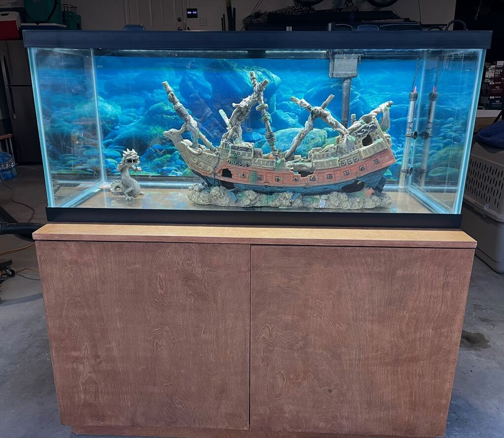 ApplePayThe fish tank is 75 gallons and in great condition. I custom designed and hand built the base cabinet stand out of 3/4” birch veneer plywood, joined with pocket holes. It has two shelves for ample storage space, a toe kick, finished edge banding, soft close adjustable hinges, a walnut stain and satin finish. The base is very solid, holds the weight of a full tank with ease and will last a lifetime. Includes: base cabinet stand, aquarium tank with both lids, tank background, heater, filter and extra cartridges, customizable color changing bluetooth led light, various decor, cleaning supplies and water treatment chemicals. Everything you need to start your own aquarium!