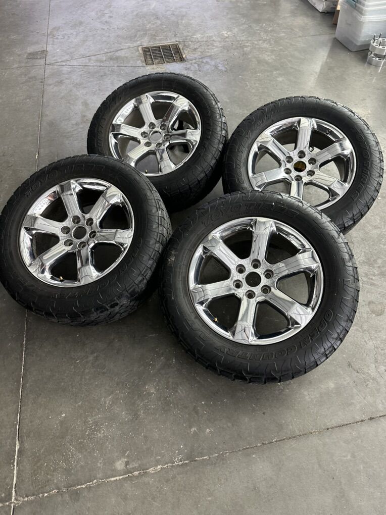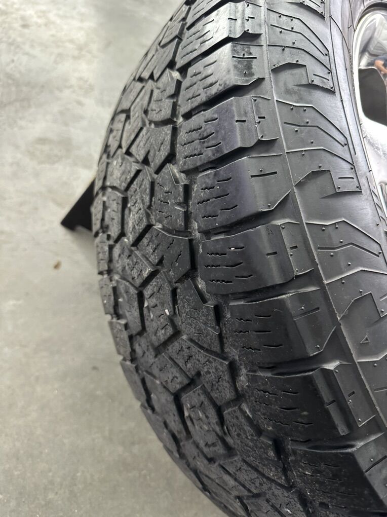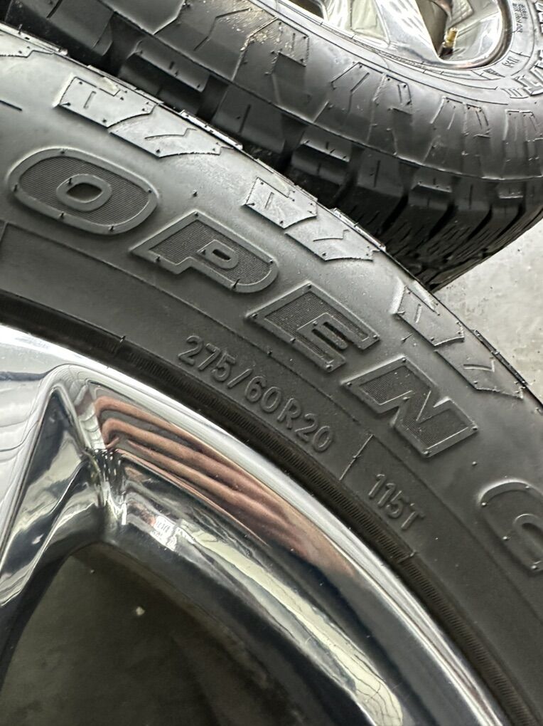 Wheels are 20in OEM wheels off a 2023 ford f150 king ranch package. Very nice set of takeoffs. No curb rash, dings or major damage. Other than some average wear, they are in great shape. No center caps ($40 on Amazon). Tires are 275/60/20 Toyo open country at3, top Of the line tires, no patches or plugs in them, tires are in great shape, with great tread life.