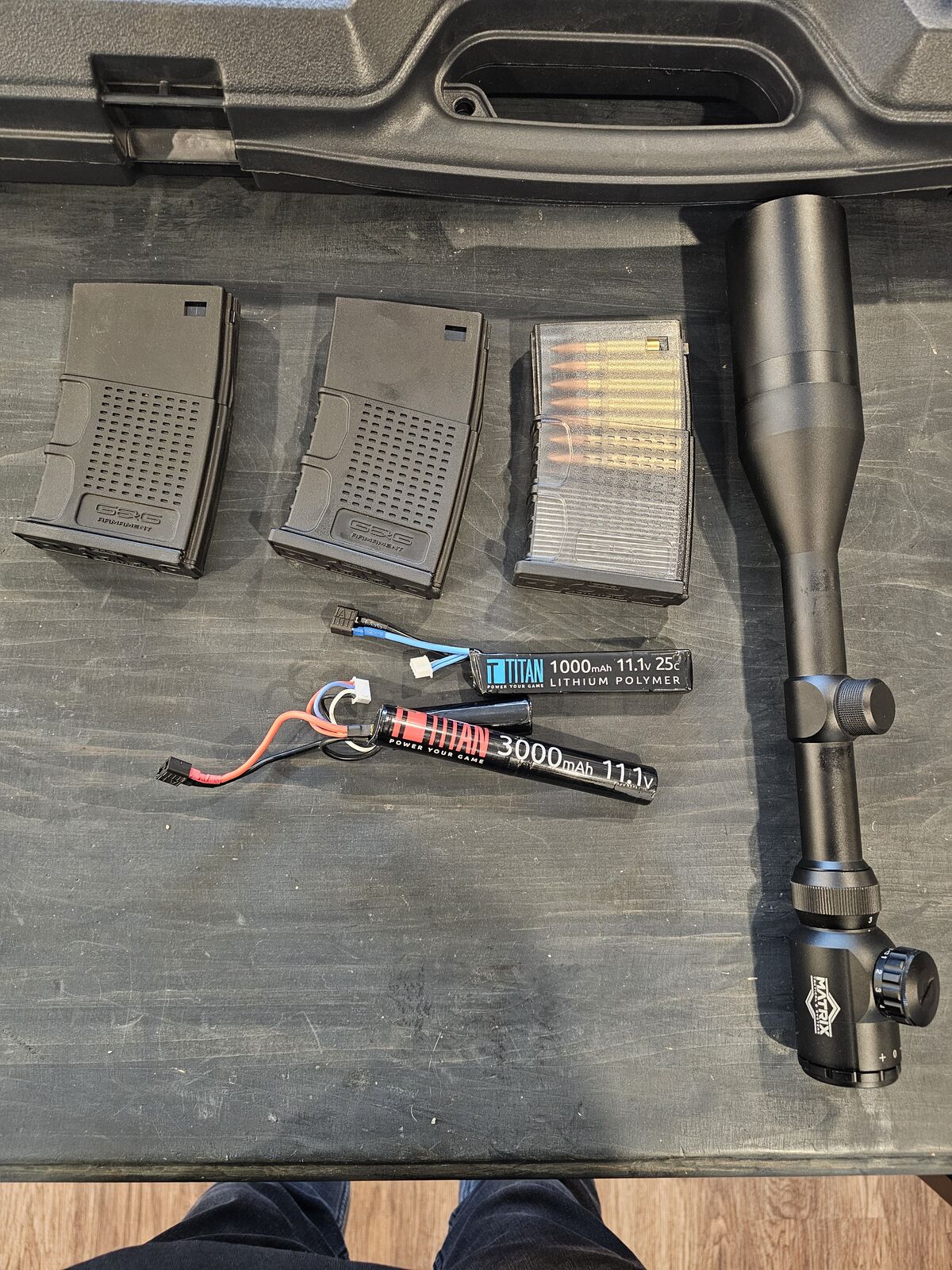 TR16 MBR 308WH with upgraded barrel, spring, and hop up unit. Parts include 3 magazines, 1 scope, and 2 batteries. All attachments on the gun are included. Shooting at 2.2 joules using .4g BBs. Basically new used in only 1 day game.