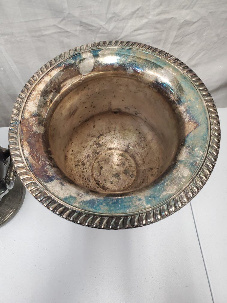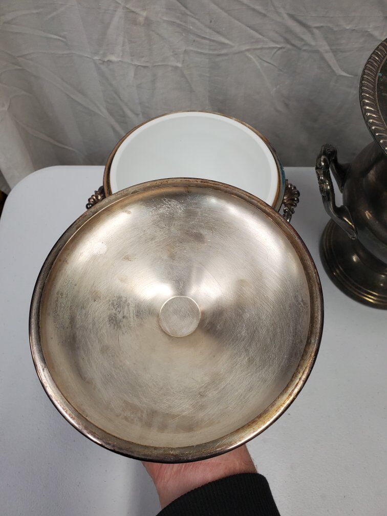 The insulated bucket is made by F. B. Roger's Silver Co. and it has a matching 9-digit number engraved into the lid and the bottom of the bucket. The bowl, inside the bucket, is white porcelain or glass. 9.75" tall by 9" wide by 7.5" deep