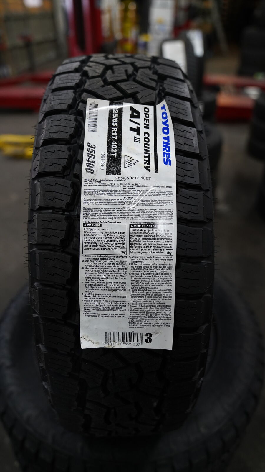 ApplePayToyo tires 225-65-17 A/T 3 with snow capabilities and a 65-mile warranty for factory defects