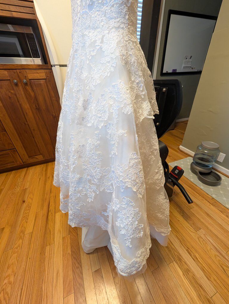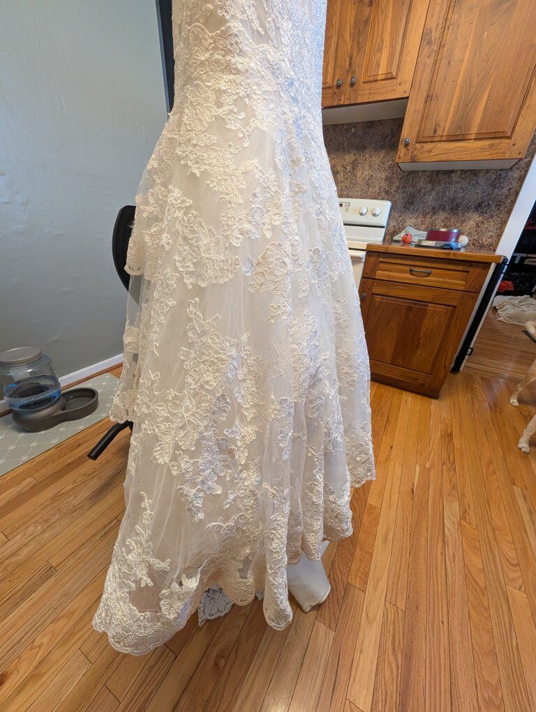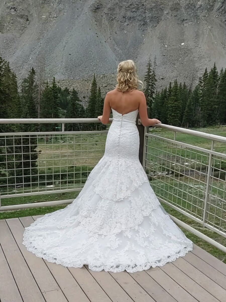 Pre-loved lace mermaid wedding dress Worn once and in excellent condition. Sweetheart neckline + layered lace train.