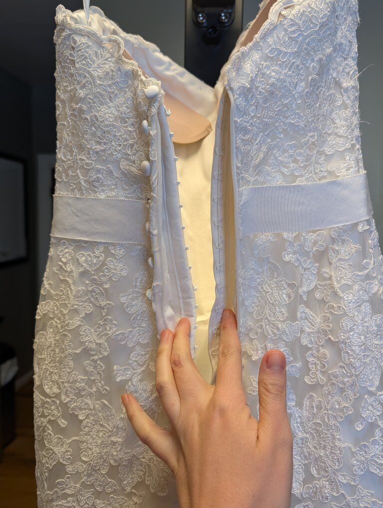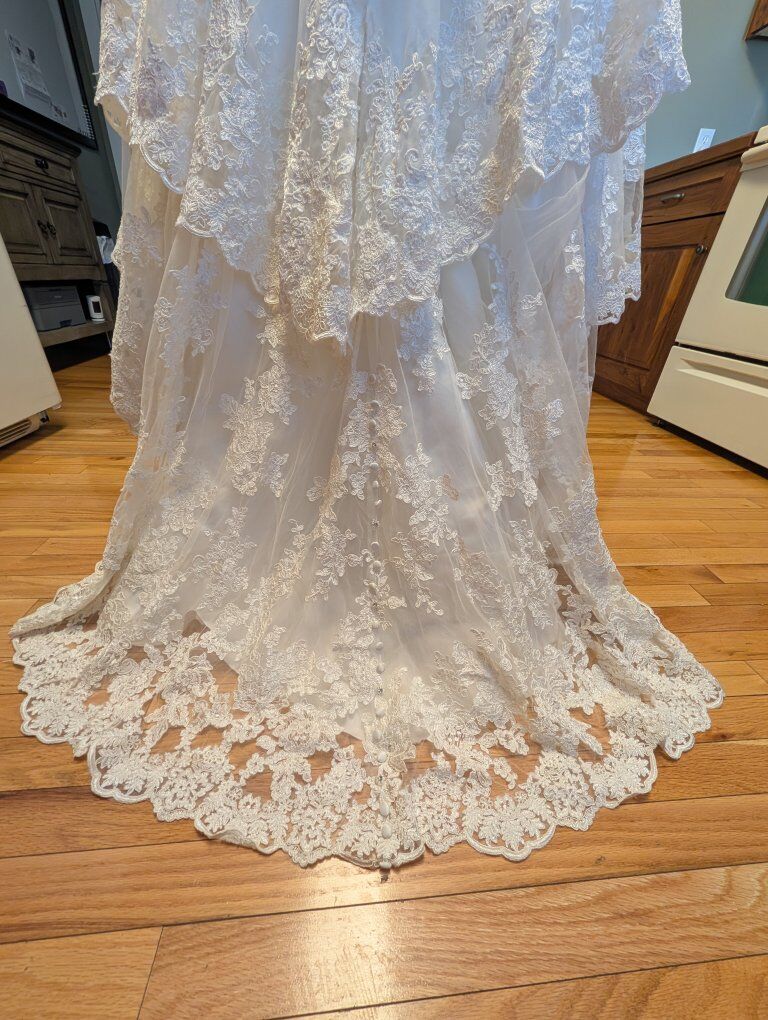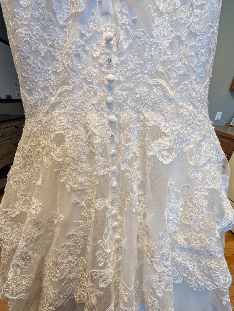 Fit details: • Tailored to fit bride in photos (5’3”, 125 lbs, 34C) • Street size approx. 2–3 • Beaded belt is sewn on • Originally a $5,000 dress Still in amazing condition. Please see photos for specific flaws (missing a button on the back)