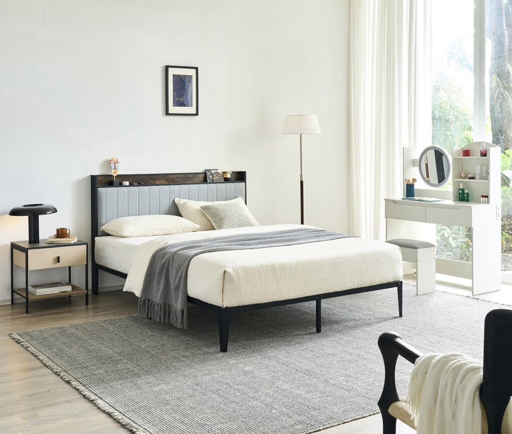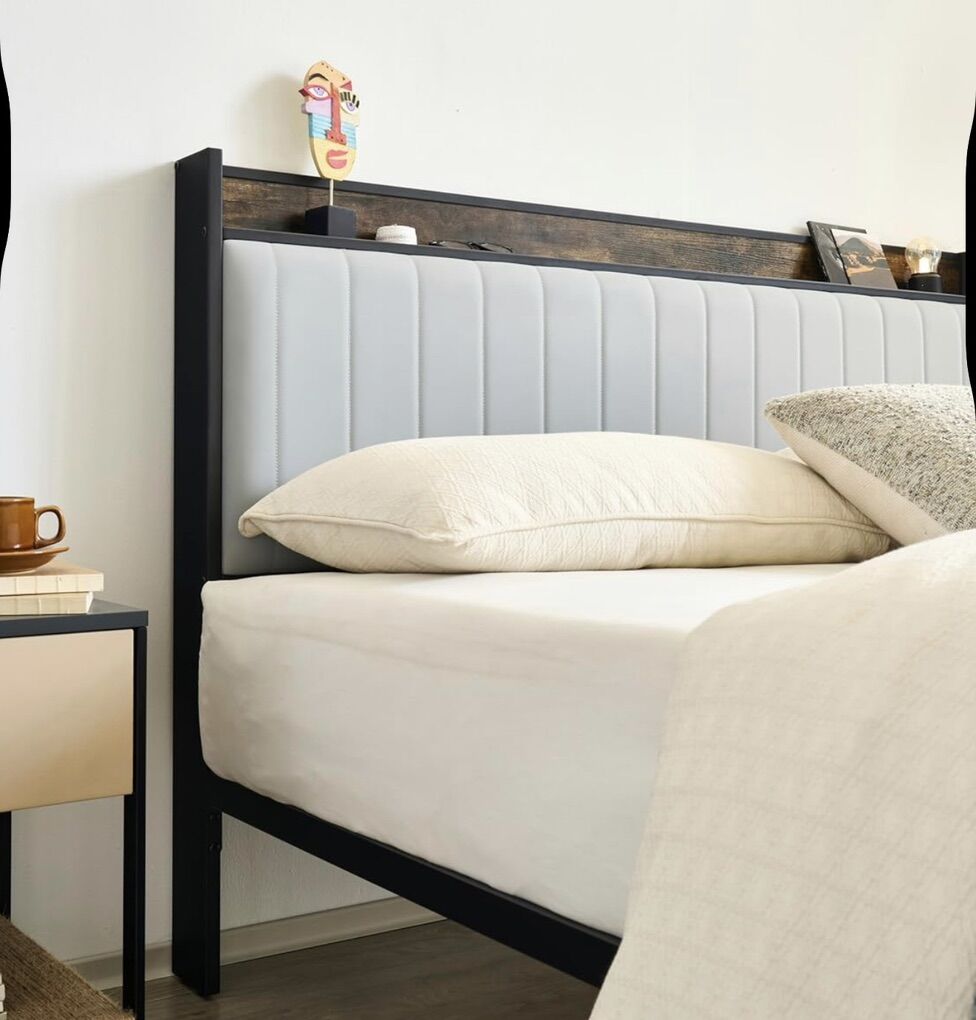 ️ Padded headboard with built-in storage shelf for phones, books, and décor ️ Strong metal frame — no box spring required