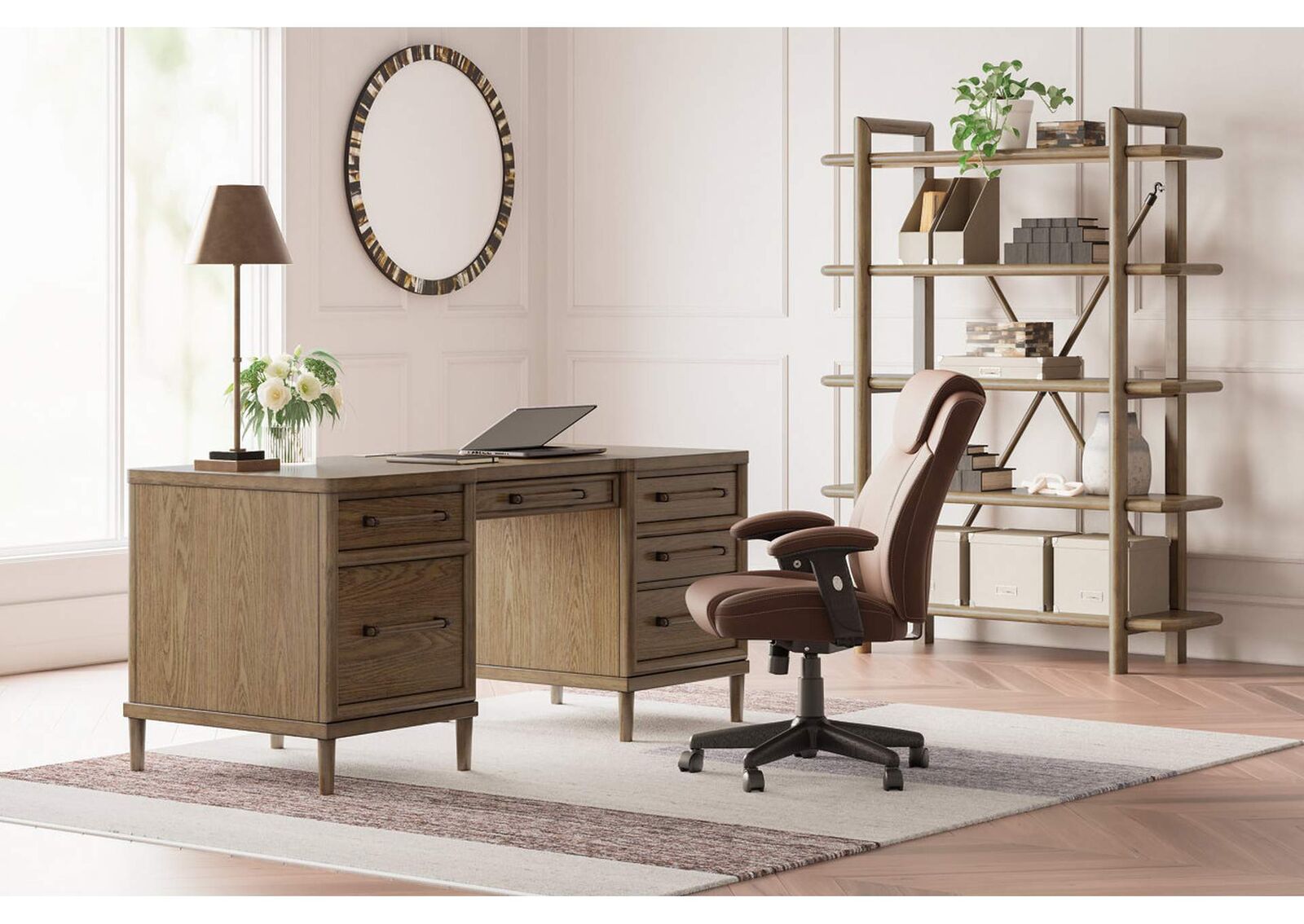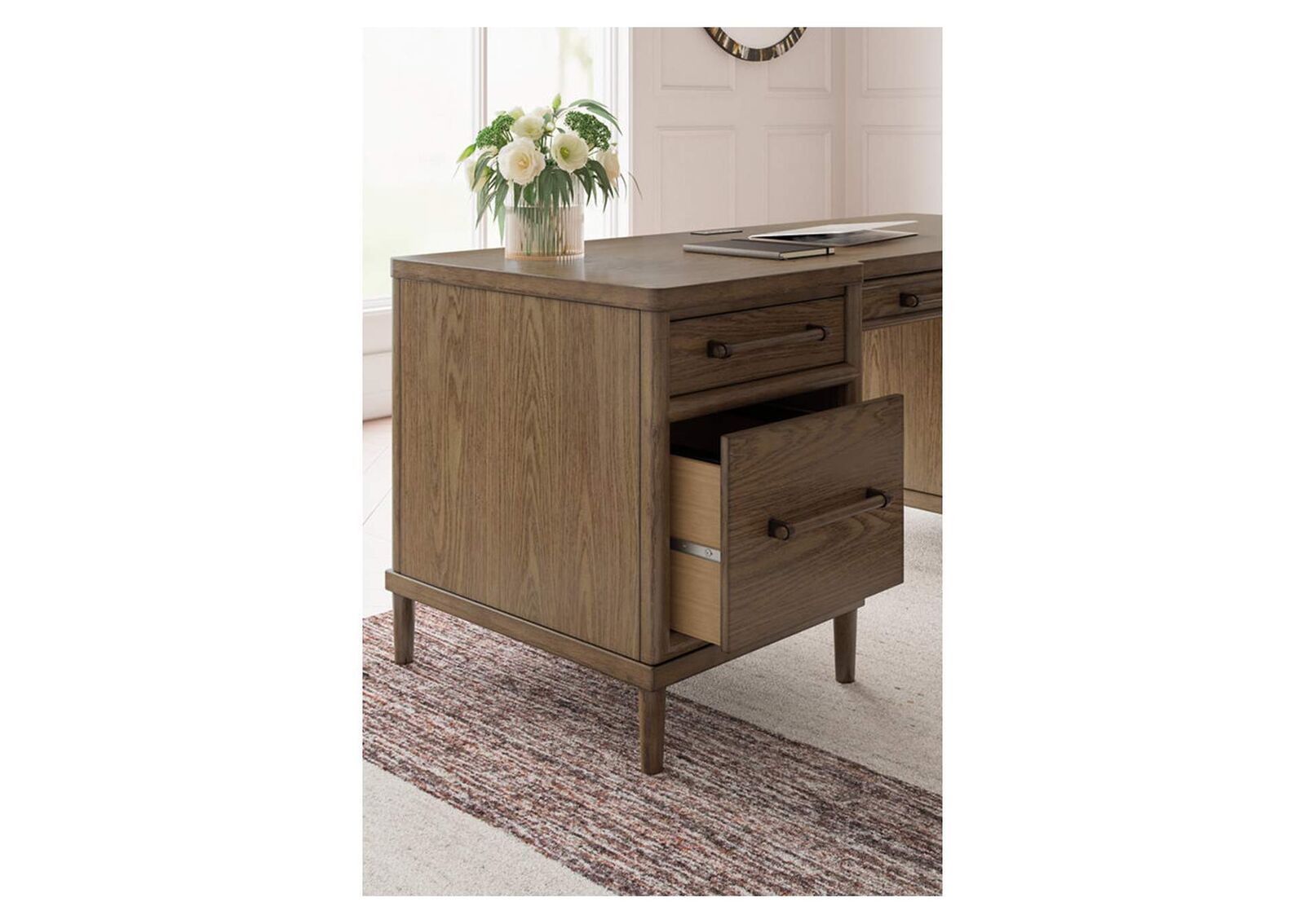Give your mid-century modern decor that finishing touch with the Roanhowe home office desk. Spacious drawers with unique wooden drawer pulls enhance the design with stunning style. This desk takes minimalism to the max.
