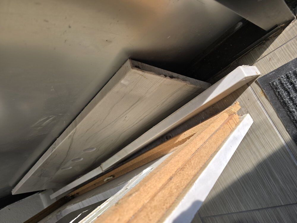 Venmowe have a 39" 1/2 × 22" 1/2 single sink vanity with backsplash. The back piece of splash is going the opposite way with the veining. The sides do match. Material is Mont Blanc. asking $400 or $455 with sink included.