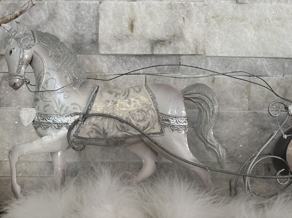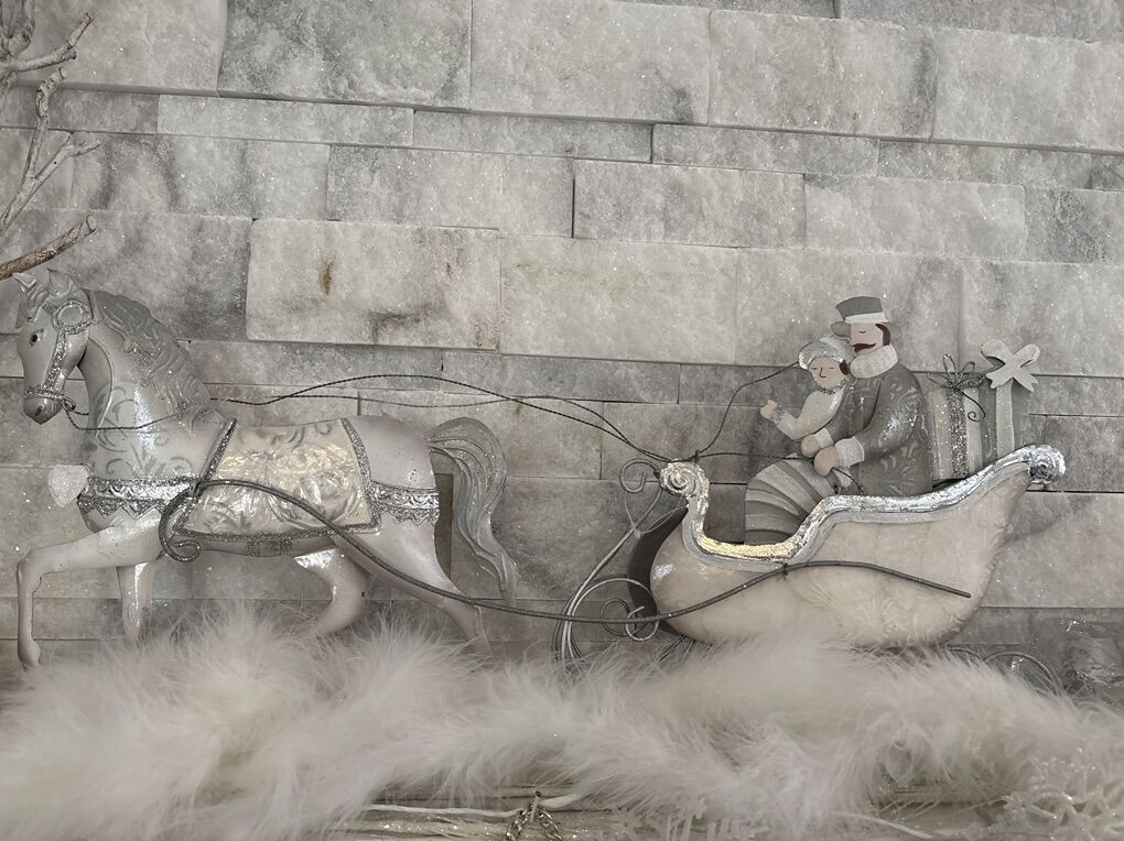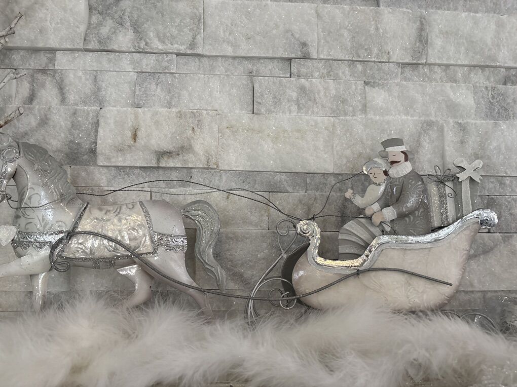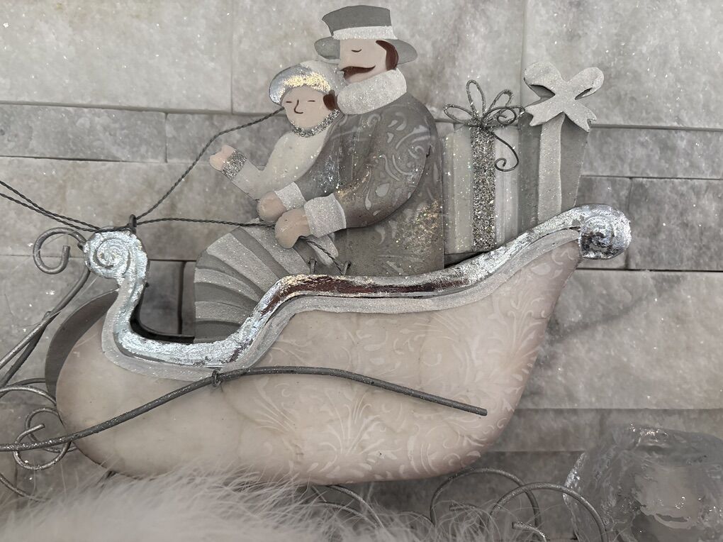 Beautiful silver metal sleigh ride. Horse and couple.size approximately 24” x 10”. Pretty