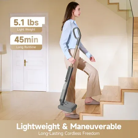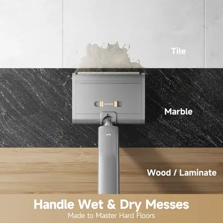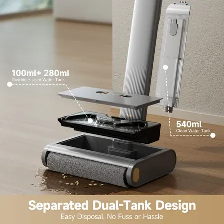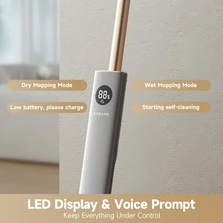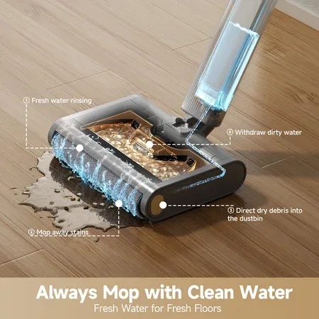 Dreame Floor X100 cordless wet and dry floor washer offers superior cleaning for tile, marble, wood, and laminate Suction-free mopping efficiently lifts wet and dry debris in one pass for a seamless cleaning experience Dual-tank system separates clean and dirty water, ensuring streak-free floors and easy disposal One-press self-cleaning brush system maintains hygiene with minimal manual effort required 165-degree lie-flat reach enables access under furniture, cabinets, and tight spaces for comprehensive cleaning Lightweight and ergonomic design for effortless maneuverability between rooms and floors 45-minute runtime accommodates large spaces, cleaning up to 3,000 ft² per charge LED display and voice prompts keep users updated on battery life, operating modes, and cleaning status