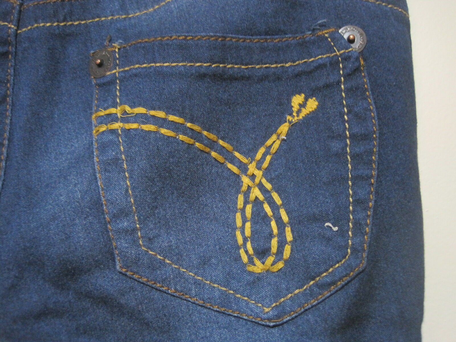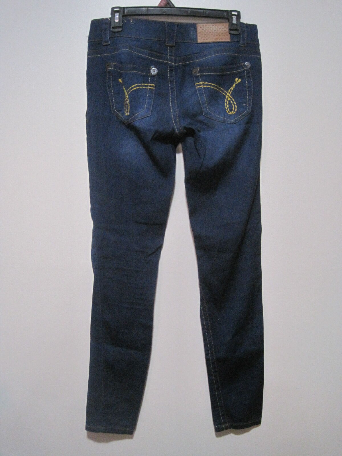 The Rewind Dark Denim Pants for women size 7 juniors feature a skinny leg style with a stretchy fabric for comfort and flexibility. The pants have a low rise waist and a 3-pocket design, making them perfect for the winter, fall, and spring seasons. With a button closure and belt loops, these stylish jeans are easy to wear and care for with machine washable instructions. The dark wash denim with light whiskering adds a trendy touch to these classic wardrobe essentials from the Rewind brand.