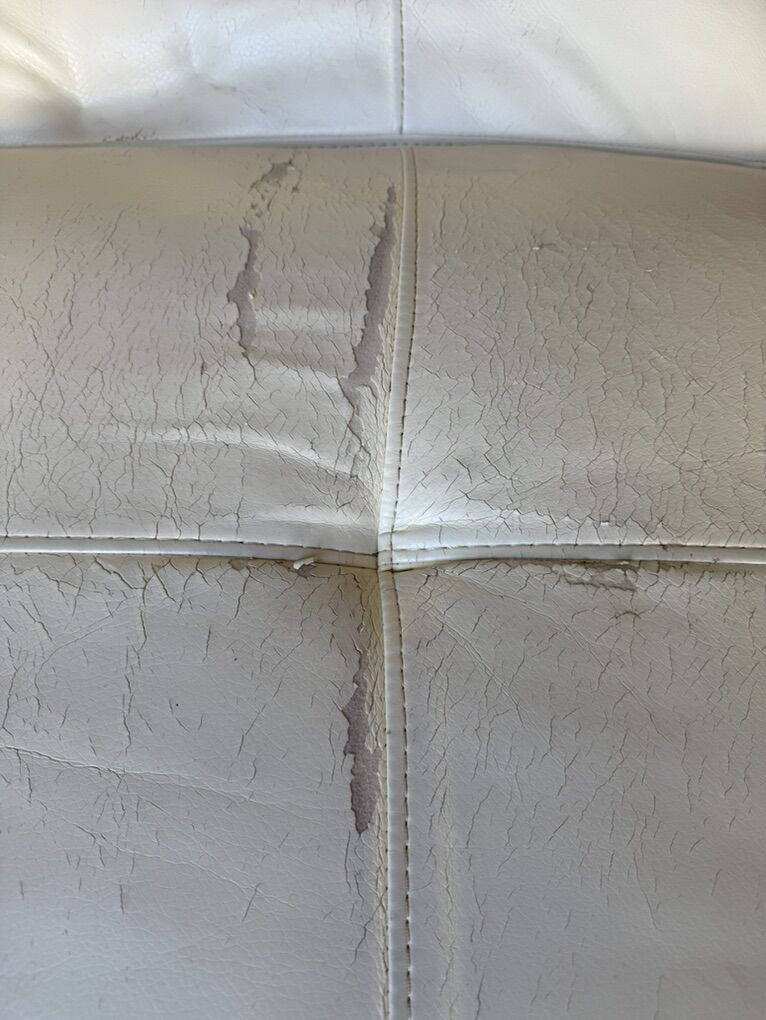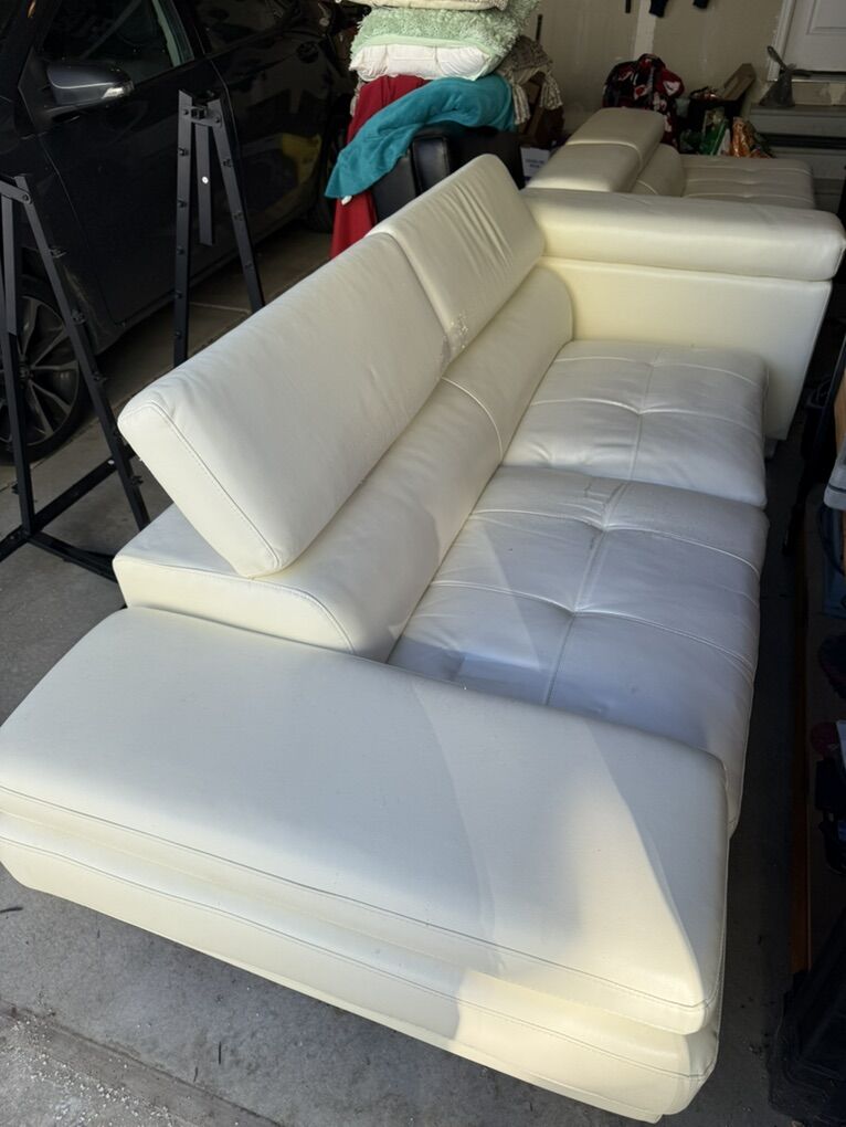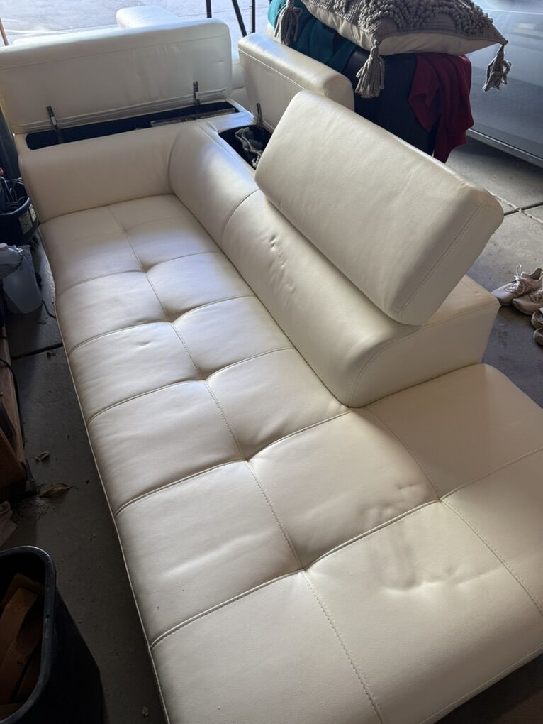 White faux leather sectional. Originally $2500 but has clear signs of use. Some cracking and peeling in the top layer and scuffs in other areas. Structurally and functionally sound. It has headrests that pop up and a couple of storage compartments. Really nice couch that would make for a fun project or could be used as is.