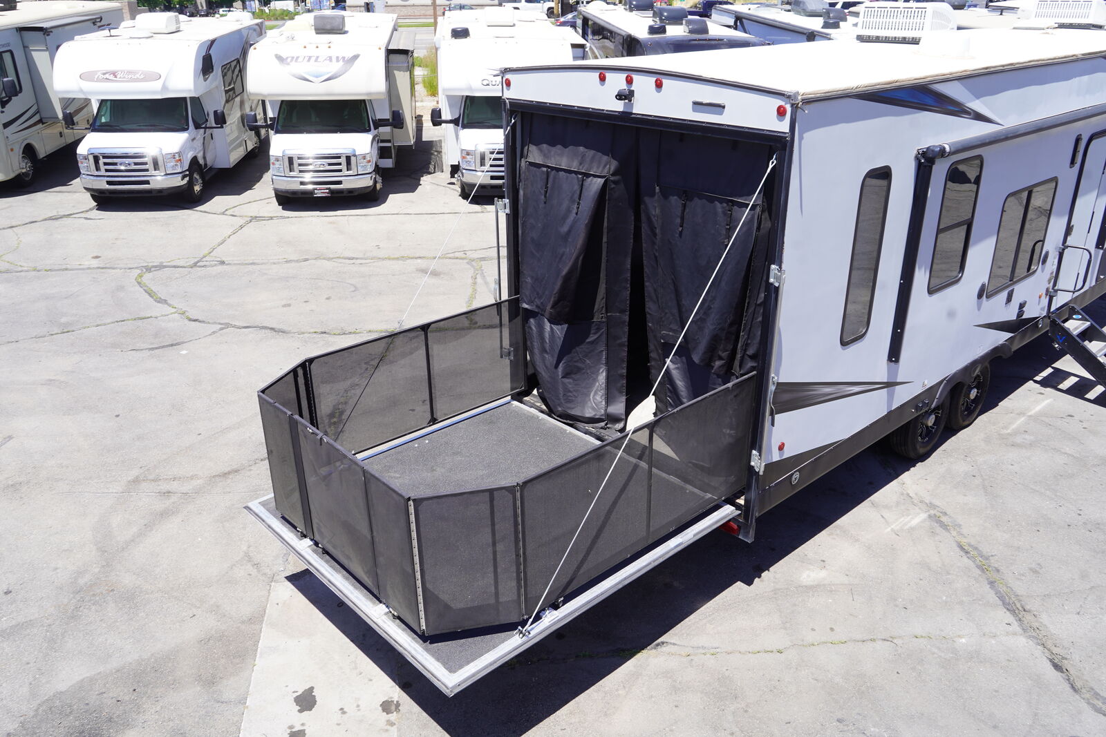 SUPER COOL TOY HAULER! ONLY 34 ft in length, but over 18 ft of interior cargo space! Very maneuverable size that is plenty spacious, but easy to pull and park! Weighing in at only 10k lbs, this trailer is EASY EASY to pull! LOADED UP with all of the good features: Double AC units, full fiberglass exterior, ONAN 5500 generator, fuel station, double bunks, rear patio with railings and rear screen, SUPER NICE, GREAT CONDITION, NICE NICE NICE!