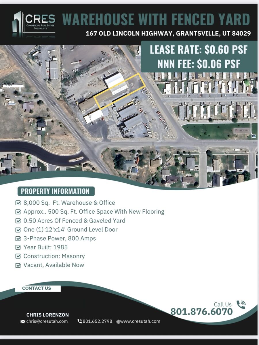 8,000 Sq. Ft. Warehouse & Office Approx.. 500 Sq. Ft. Office Space With New Flooring 0.50 Acres Of Fenced & Gaveled Yard One (1) 12'x14' Ground Level Door 3-Phase Power, 800 Amps Year Built: 1985 Construction: Masonry Vacant, Available Now