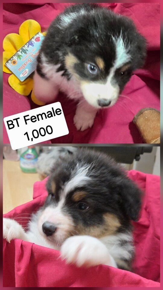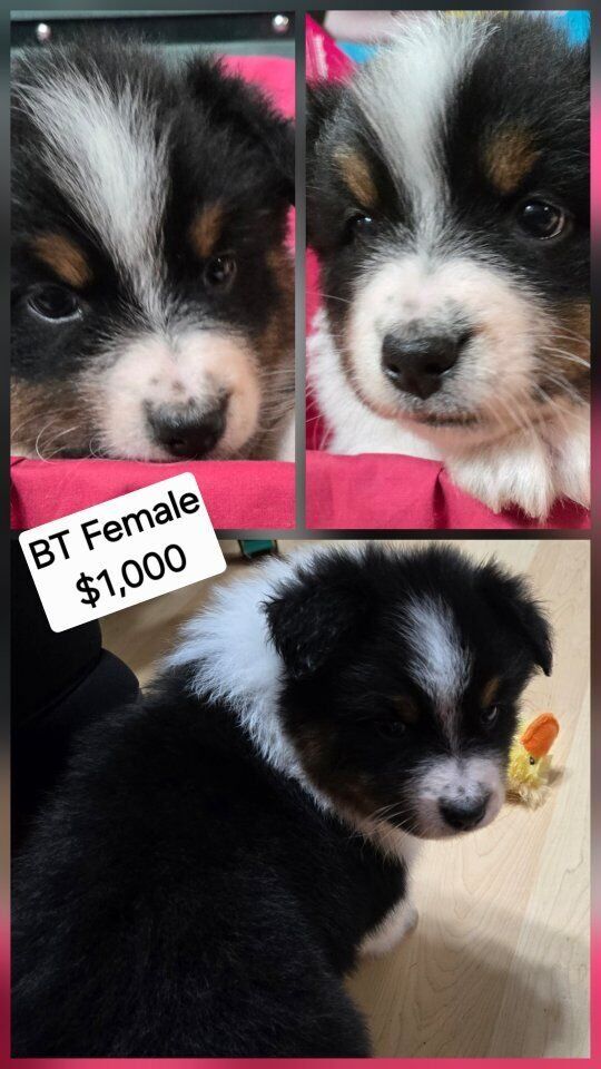These purebred standard sized Australian Shepherd puppies are so cute! They are ten weeks old and are ready for their furever homes now. The Red Tri may have some blue/blue marble or green combination eyes. All will be wormed, up to date on shots, and have tails docked and dew claws removed. The puppies are crate trained and have had no accidents at night since they were 4 weeks! They are well loved, played with, and have been around children. They know basic commands (sit, down, fetch, beg, stay) and are learning to walk on a leash. Red and Black Tri are $1,000. Call or text 801-244-1966 to choose your favorite today!