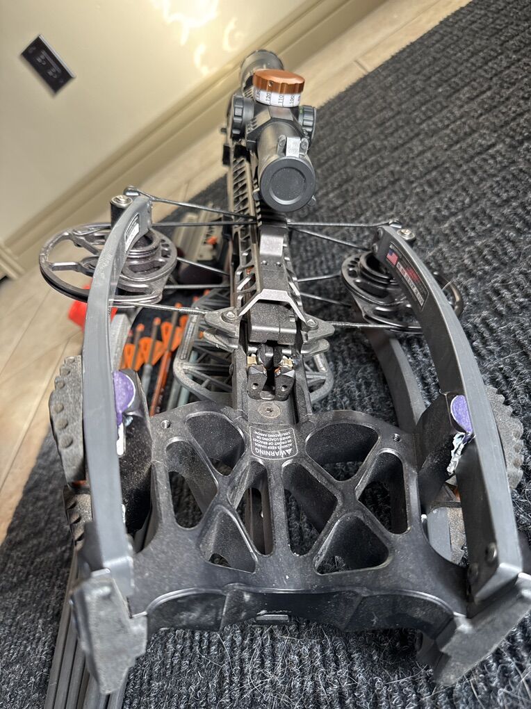 This is the Ravin 500 Sniper package with electric crank and hard case. Bow was just returned from Ravin where it received the update of new strings, limbs, and cams. Sight was taped for the bows 500 fps arrow speed with the turret scope. Call with any questions. Bow is ready to go with a dozen bolts, charger, and battery