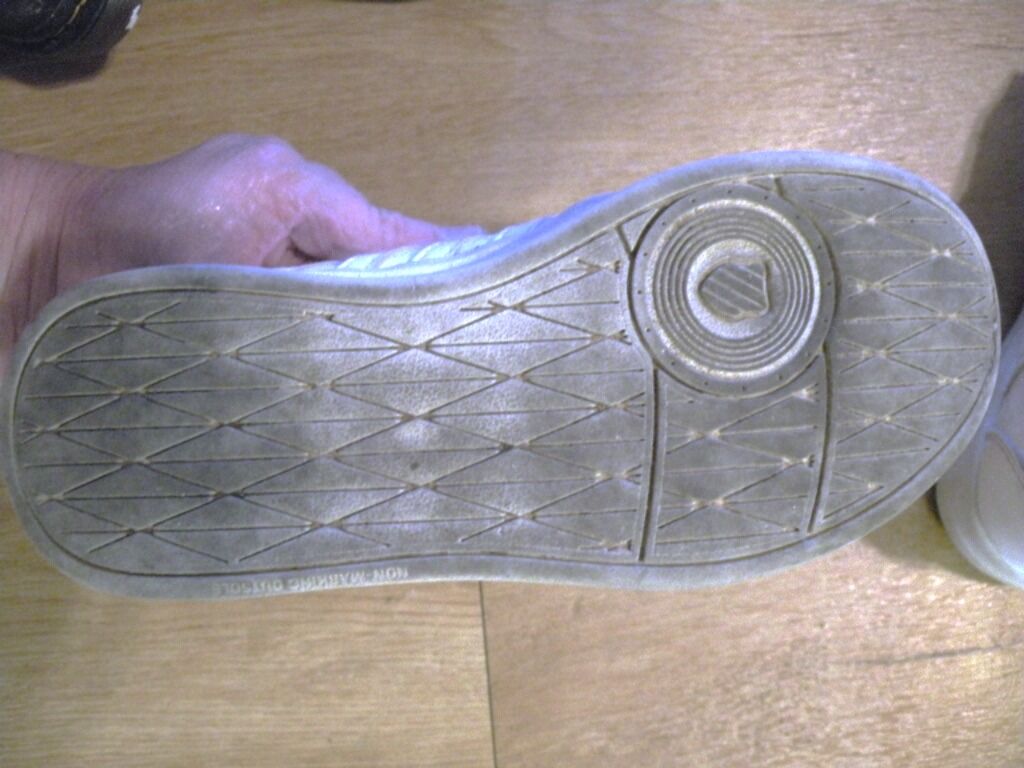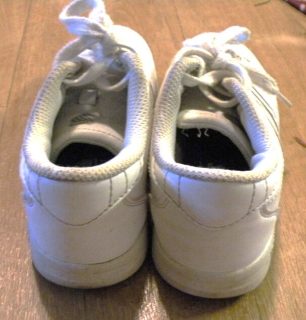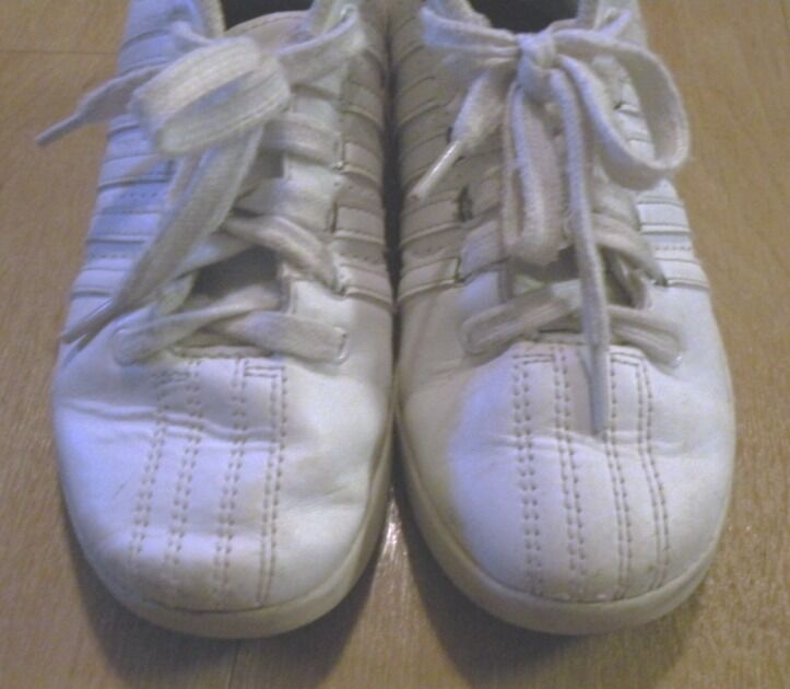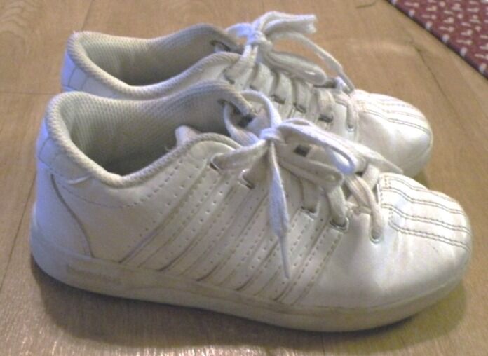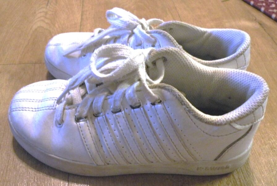 White K-Swiss Classic VN Tennis shoes in size 1. Have some wear but still in good condition. There is some wear on the toe area and on one side. These are very well padded and a sturdy shoe which will last a long time. They can be washed. Soles still have quite a bit of wear left on them but have blackened from use. Leather upper with a classic 5 stripes on side and three-piece toe. Metal D rings to keep laces in place. Rubber outsole EVA sock liner. Perfect for Park and Playground.
