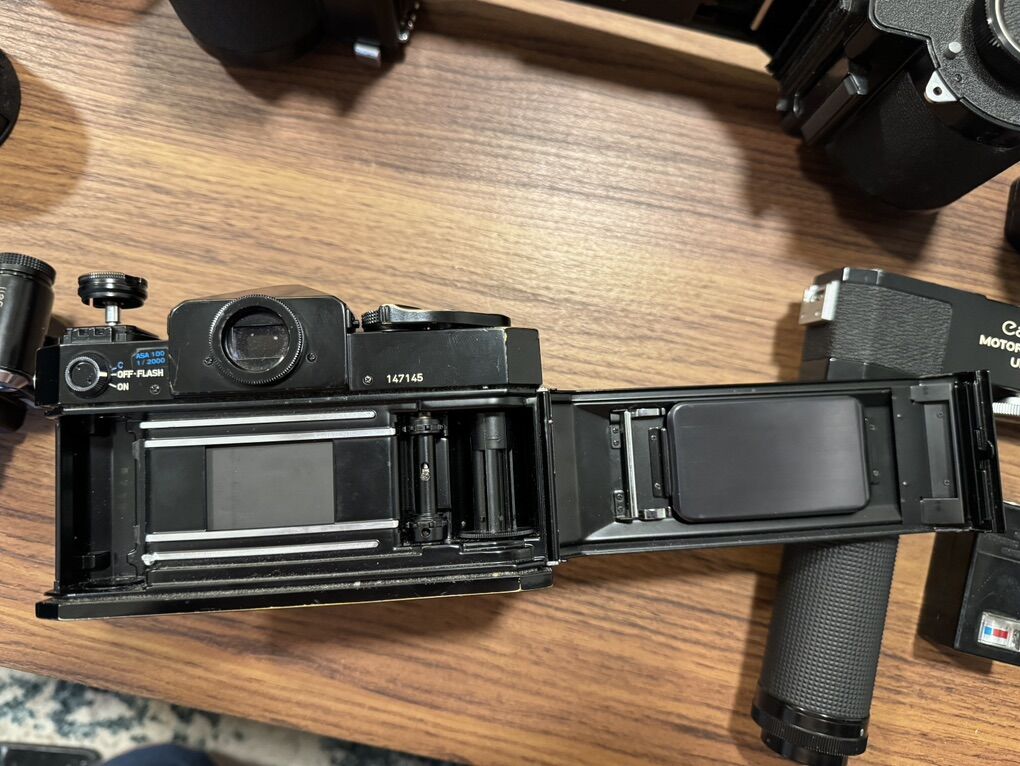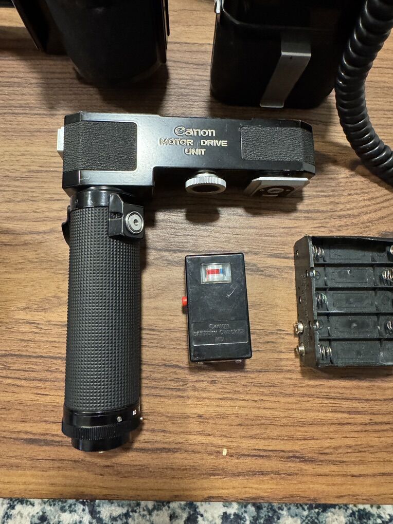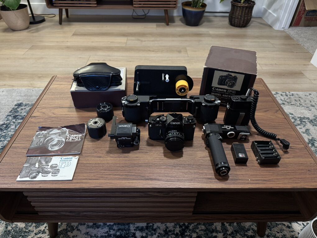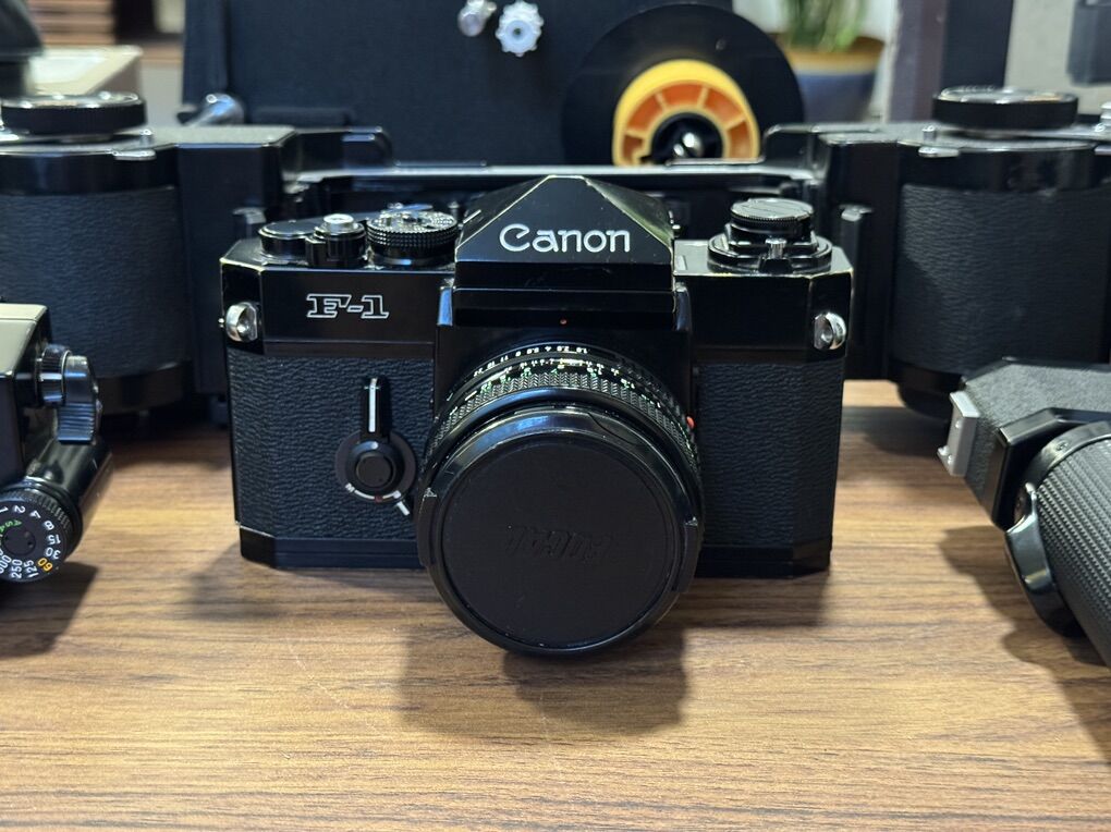 ApplePayAn original Canon F-1 manufactured in 1972 (S/N M218) with a 50mm lens. It comes with a motor drive, battery pack (with extra battery insert), film chamber 250, 2 extra 250 film magazines, Film loader 250, Servo EE finder, battery checker, hotshoe mount, and an additional focusing screen.
