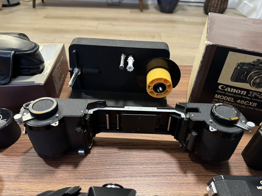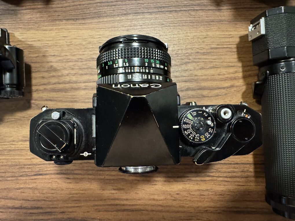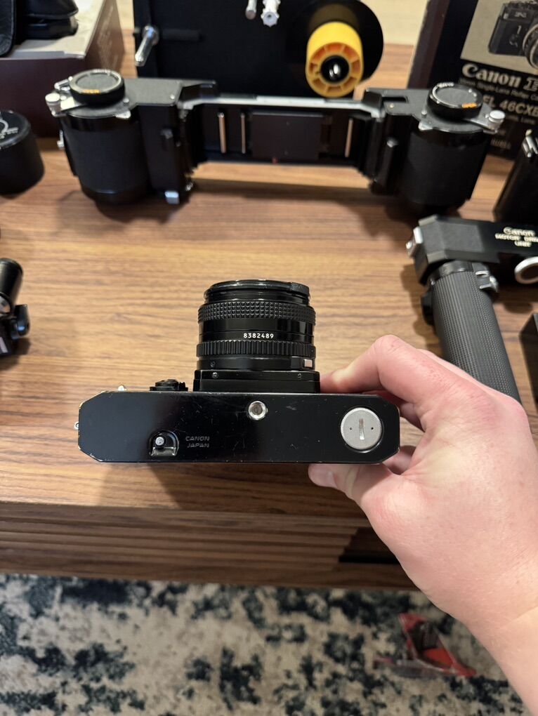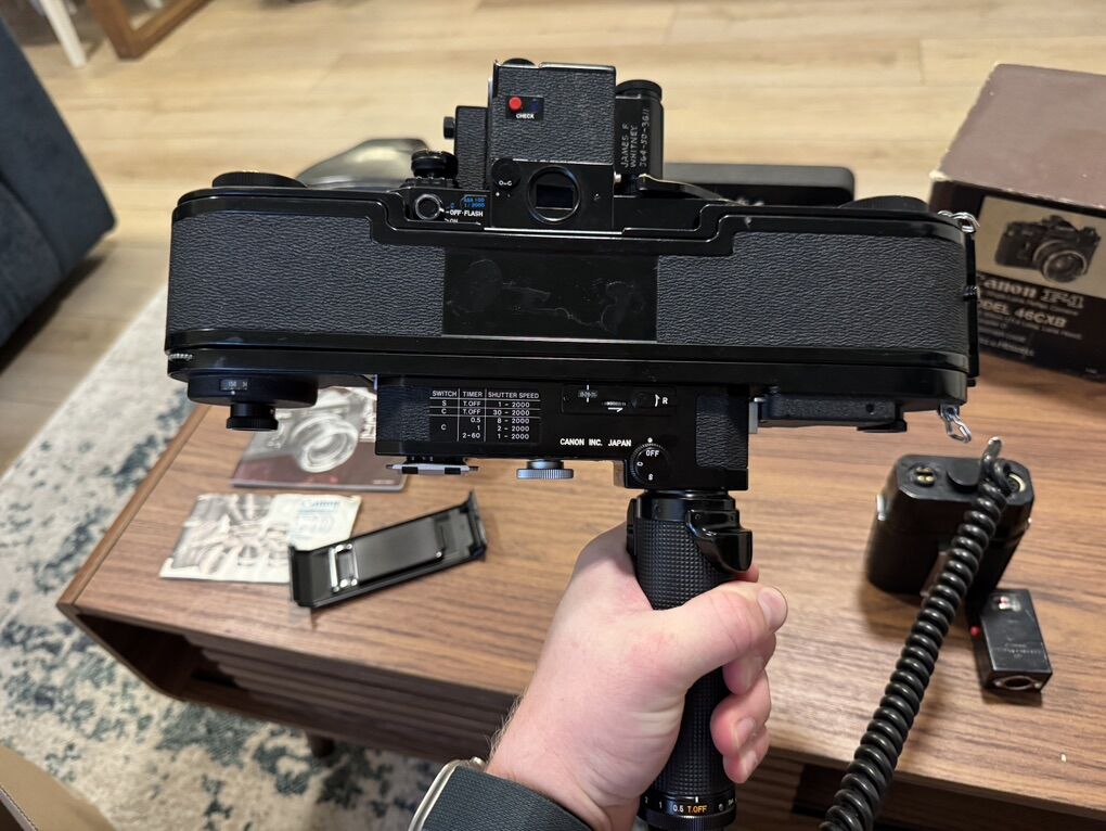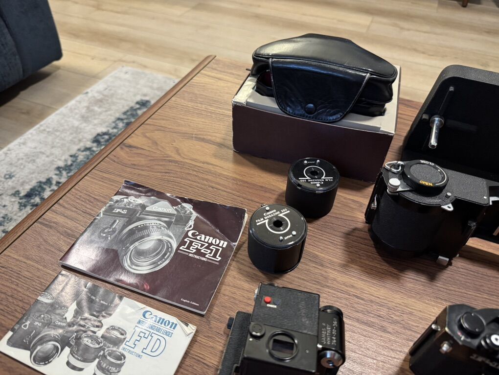 ApplePayAn original Canon F-1 manufactured in 1972 (S/N M218) with a 50mm lens. It comes with a motor drive, battery pack (with extra battery insert), film chamber 250, 2 extra 250 film magazines, Film loader 250, Servo EE finder, battery checker, hotshoe mount, and an additional focusing screen.