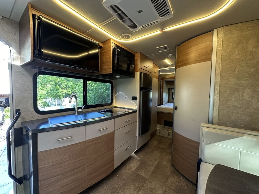This is one of Winnebago’s most popular floorplans. It features a full rear slide-out bed, a dinette that converts to a bed, and a cab-over bunk, allowing it to sleep up to 6 comfortably. Spacious interior with slide-outs makes it feel much larger than its size.