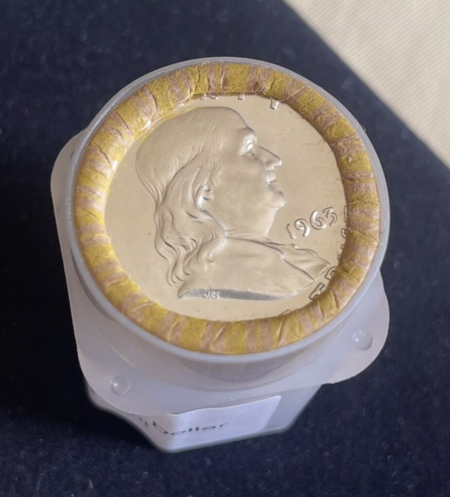 *Collectors Item at nearly Spot Price 1963 Franklin Half Dollar MS60 90% Silver Roll of 20 Uncirculated Mint Roll from the Philadelphia U.S. Mint in excellent condition. JRS obverse By chief engraver John R. Sinnock (designer of the coin)