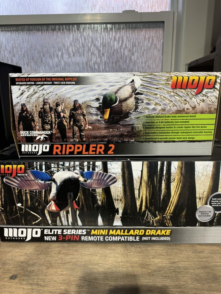 Decoys: $300 4 Dozen Assorted Decoys - Rig ‘Em Right Anchors 2 Mojo Mallard Drake Ripplers 1 Mojo Mini Mallard Drake Spinner ( Battery)