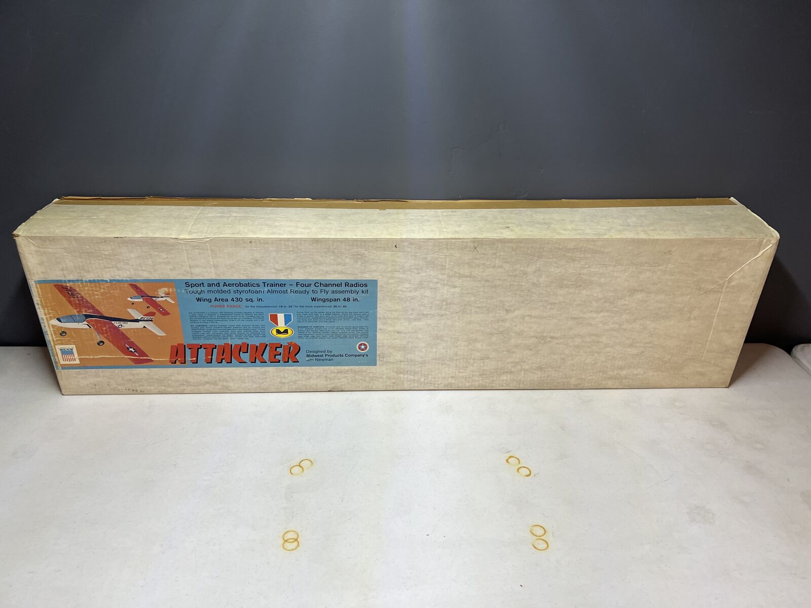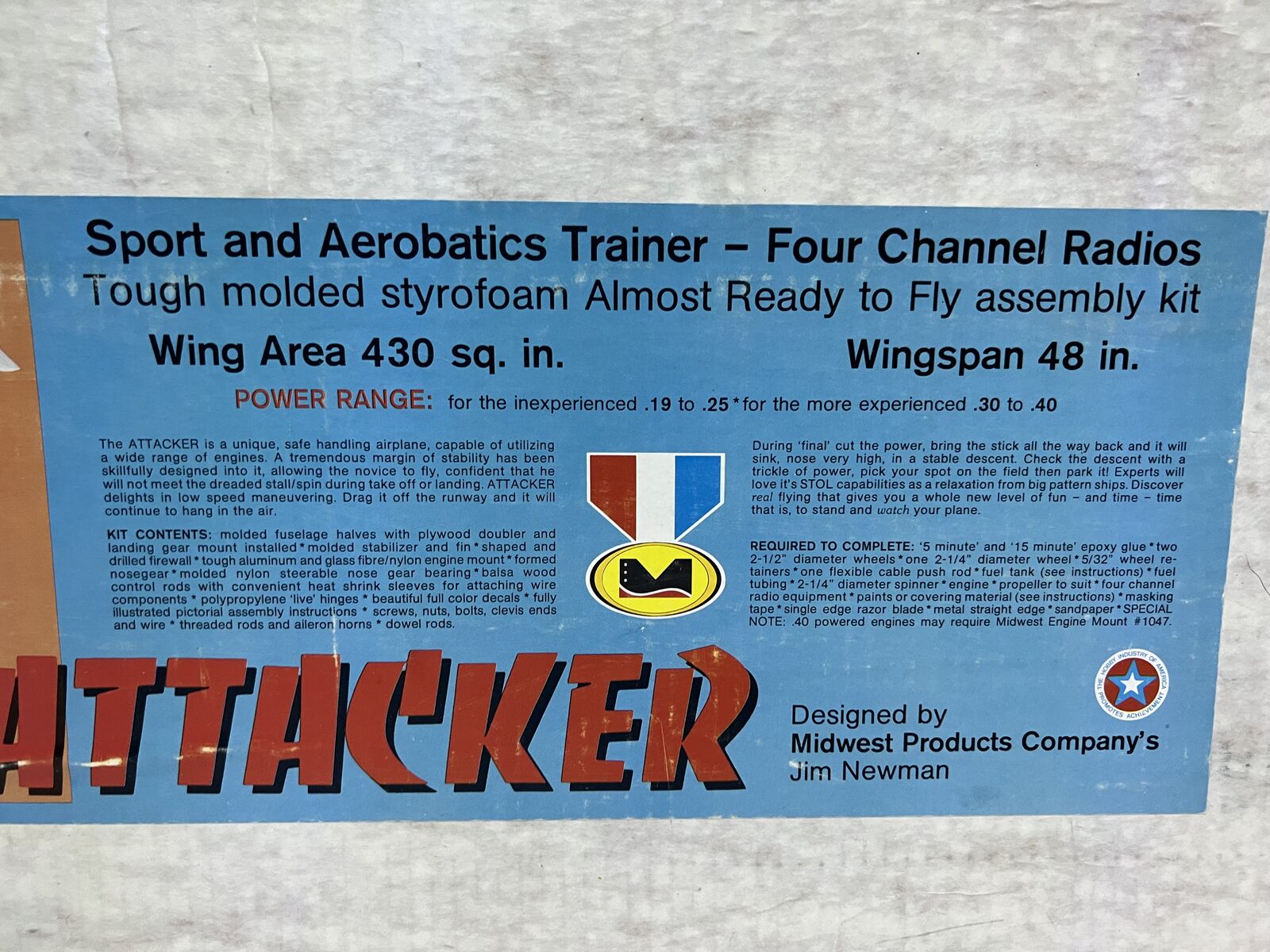 ApplePayMidwest Attacker ARF NIB (Vintage 1970's) Specifications: Wing Span: 48 inches Wing Area: 430 sq. in. Engine: 2-stroke .19 - .40 or electric equivalent. Asking $135.00 or best offer posibly trade for other NIB Balsa Kit.