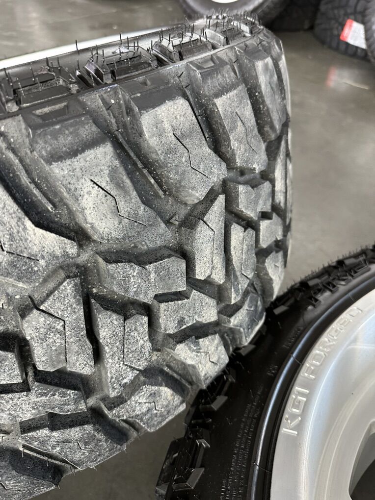 Wheels are 24x12 kg1 forged “rebels” these wheels are unlike most, they have a brushed finish, with a Powdercoated clear coat. Very durable and great looking set of forged wheels. Billet forged center caps are also included and in perfect shape. Wheels themselves are in great shape, light curb rash, but overall in great shape. -44 offset Tires are 35x12.50r24 prevail m/t, load range F, 12ply, top of the line tires, no patches or plugs in them, less then 3k miles on the tires so they are pretty much brand new.