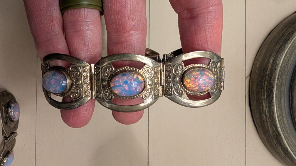 VenmoRed Bracelet: vintage sterling silver link bracelet with carved red coral or carnelian stones in an Aztec motif. Turquoise Bracelet: vintage Mexican Taxco sterling silver bracelet with abalone inlay. Opal Bracelets: Vintage Taxco Sterling Silver Faux Opal Glass Cabochon Wide Panel Bracelet