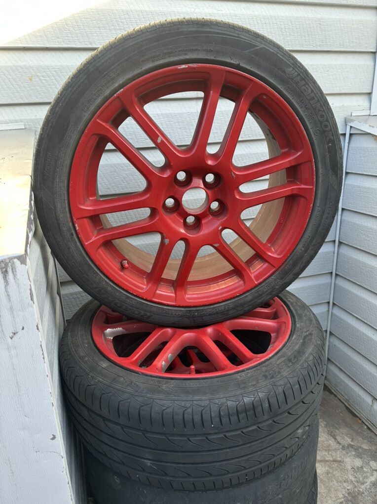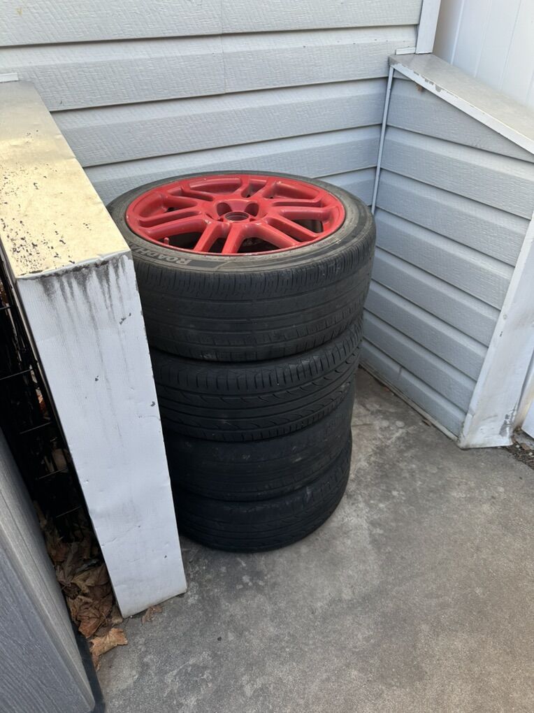 I got new tires with rims included this is the original stock rims from scion tc , I painted them red a few years ago. Tires aren’t the best but if you need rims these are great OBO