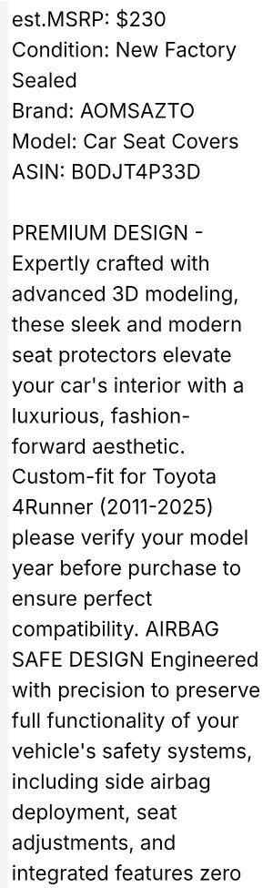 New in box Toyota Runner 2010 to 2024 front and back Read description List $ 230 Sell $150