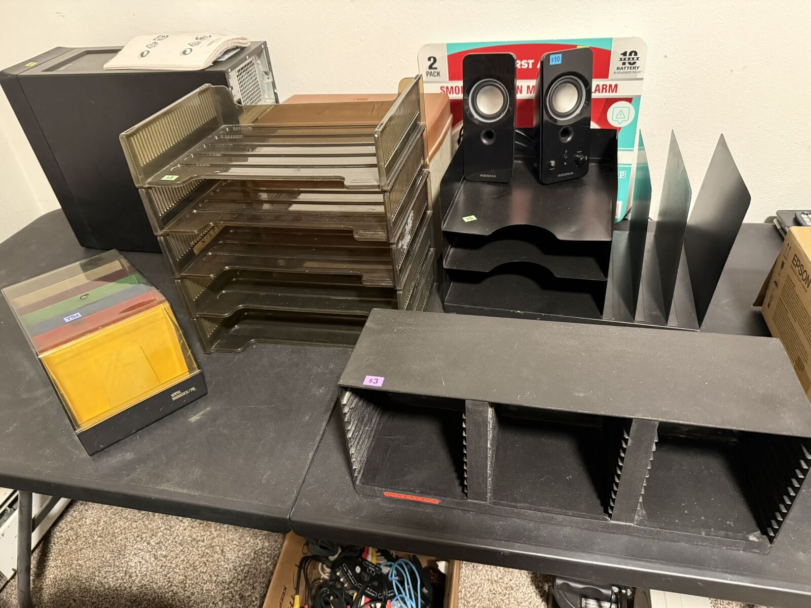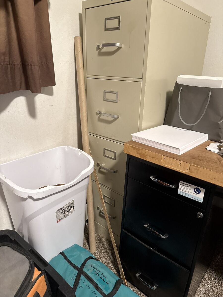 VenmoVa,rious black bookshelves, 4-drawer filing cabinets, 2-drawer filing cabinets - will add wood desk top if both cabinets are purchased, rolling brief case, Epson VS250, new projector, various office organizers, binders, printer products, office chair, floor mat for desk chair. Pick up only in Lyman WY. Prices vary per itm.