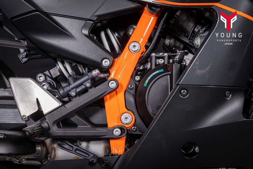 The KTM 990 RC R has two strong characteristics: it's a saliva-inducing track tool as well as an acute expression of sports performance for the street with all the criteria necessary. To these ends the chassis geometry is weighted and fixed accordingly with an emphasis of 52.5% to 47.5% front/rear. The offset is measured at 33 mm with a steering angle at 25 degrees (per side) for improved steering sensation and a planted front end. The aluminum diecast swingarm with a linkage construction brings increased flex for better stability, and manageability for bumpy track and street surfaces, of this 405.6 lb/184 kg (dry weight) rocket.