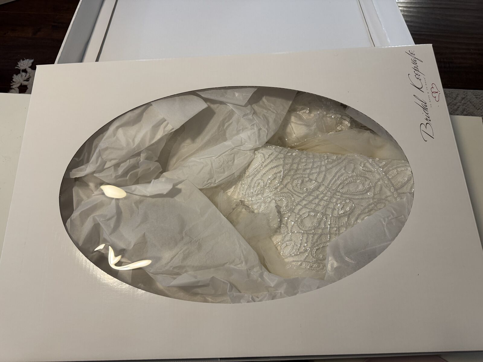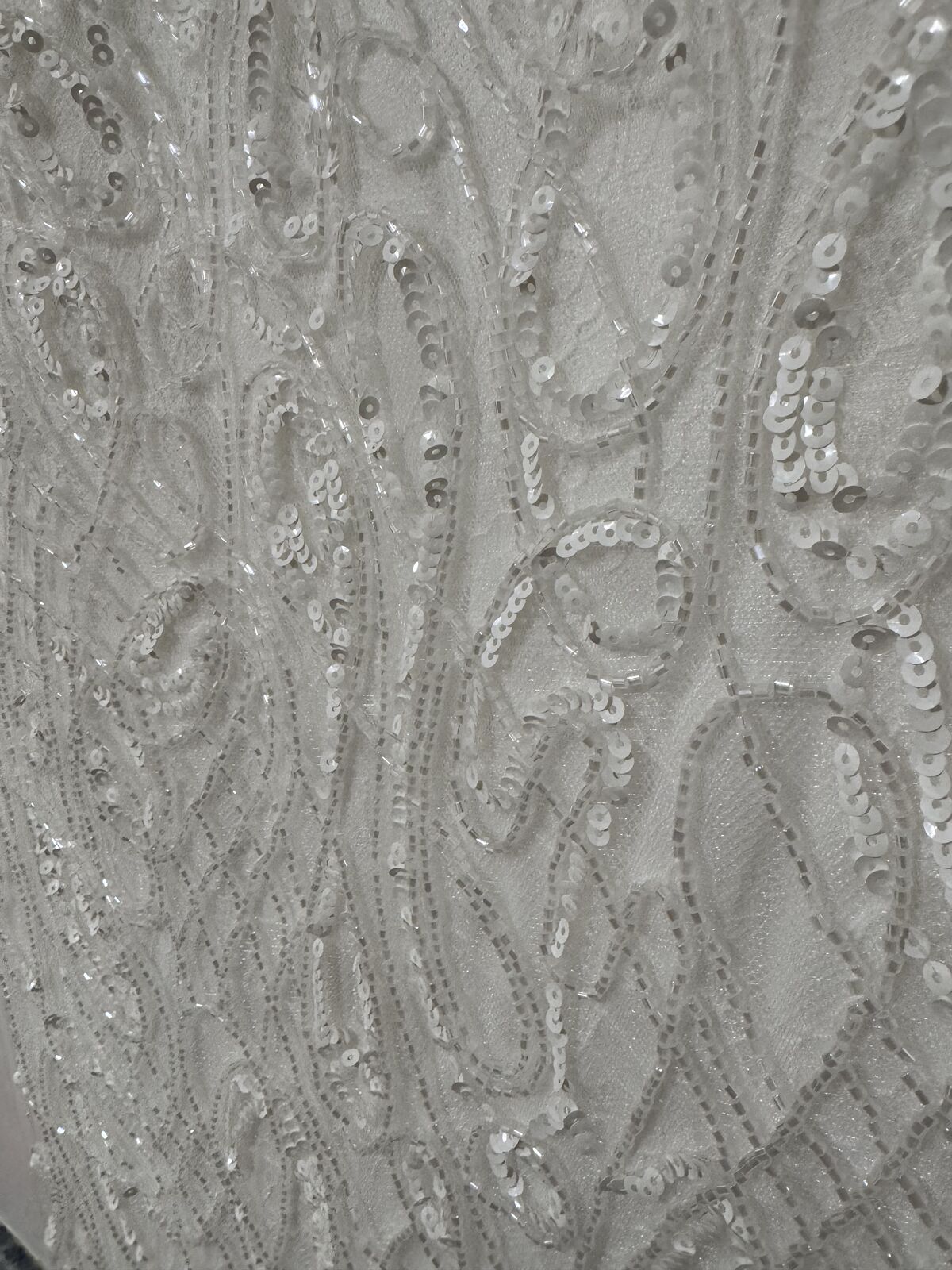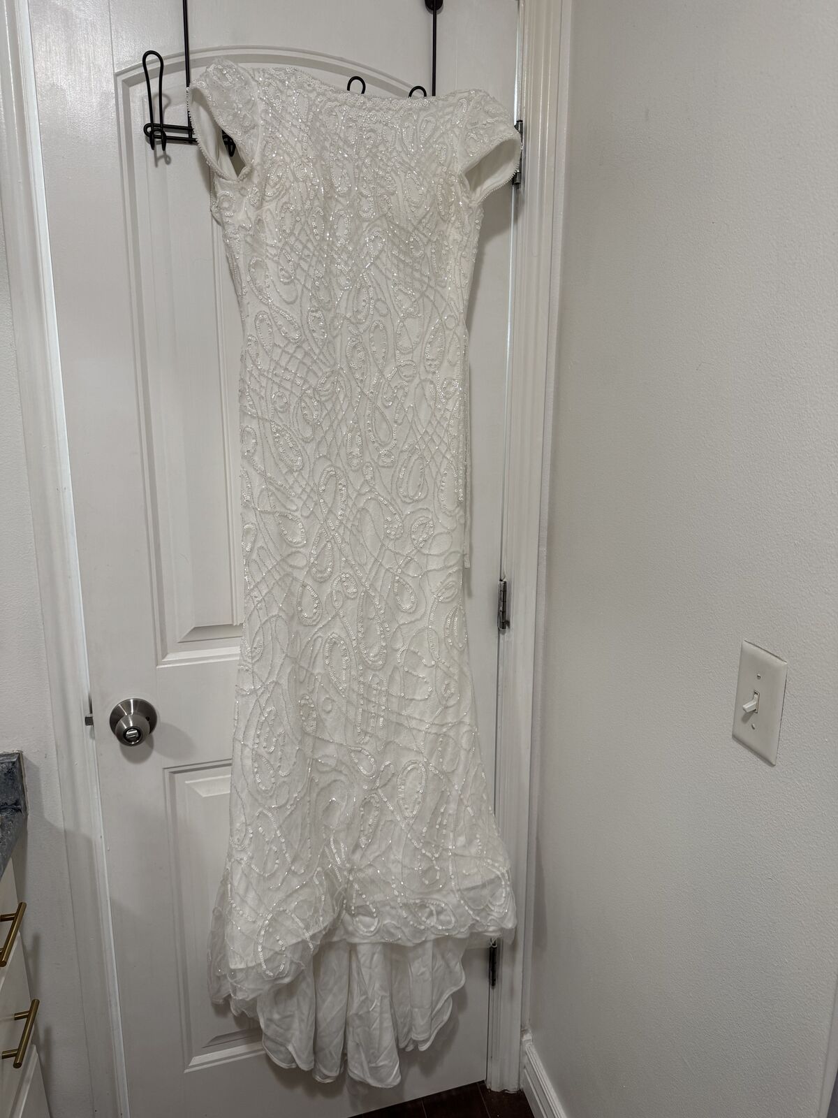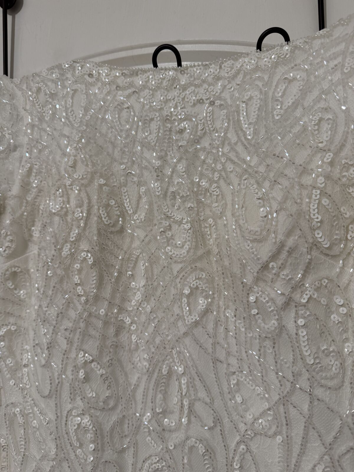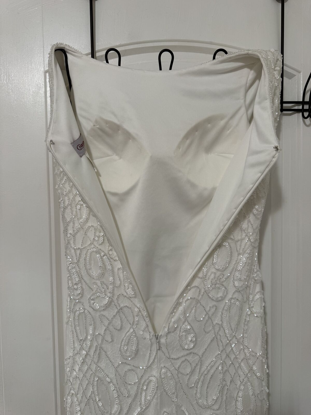 VenmoElegant Christina Wu Eternity ivory gown with intricate Art Deco beading and sequins, tailored from size 4 to 0, fits brides 4'10 to 5'2. Features bateau neckline, cap sleeves, and a light chapel-length veil with a trailing train. Timeless 1920s-inspired sheath silhouette perfect for vintage bridal glamour. Excellent condition, ideal for petite brides seeking understated elegance