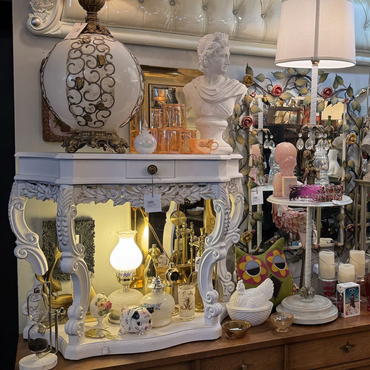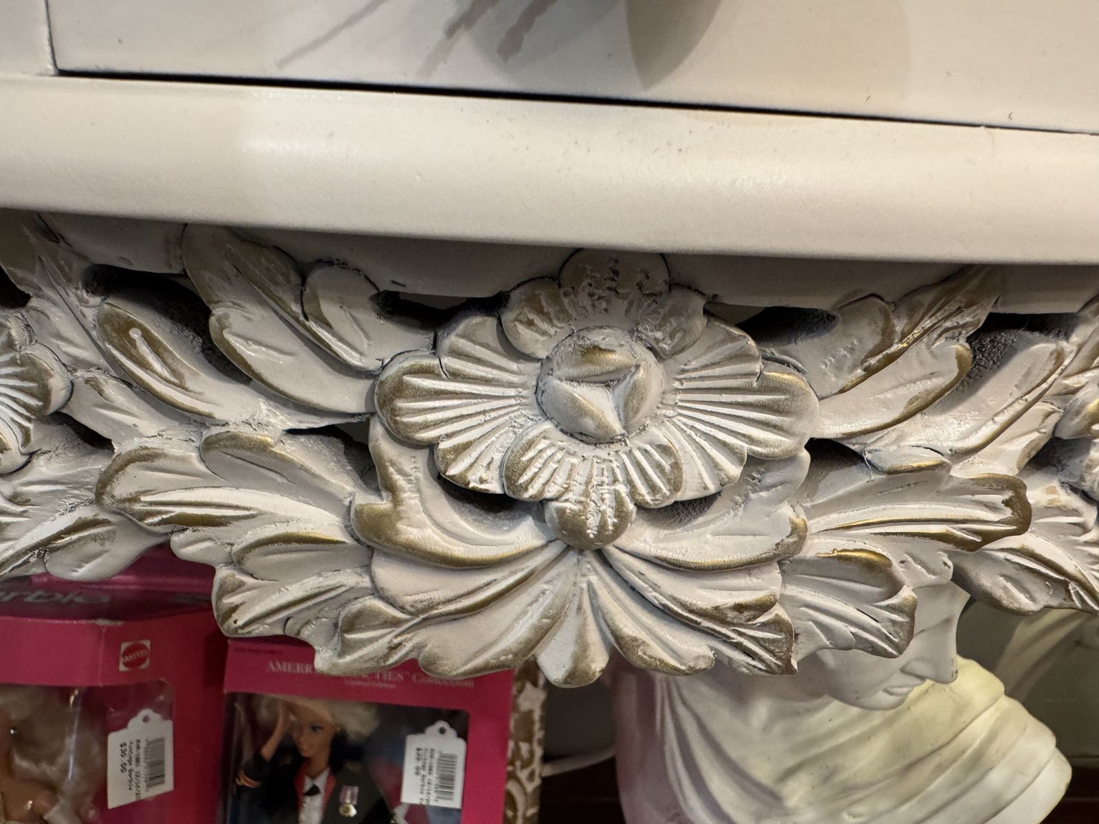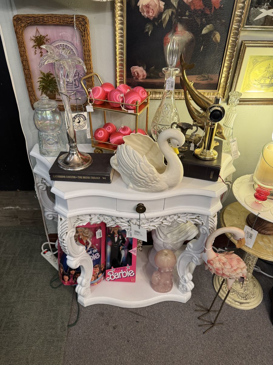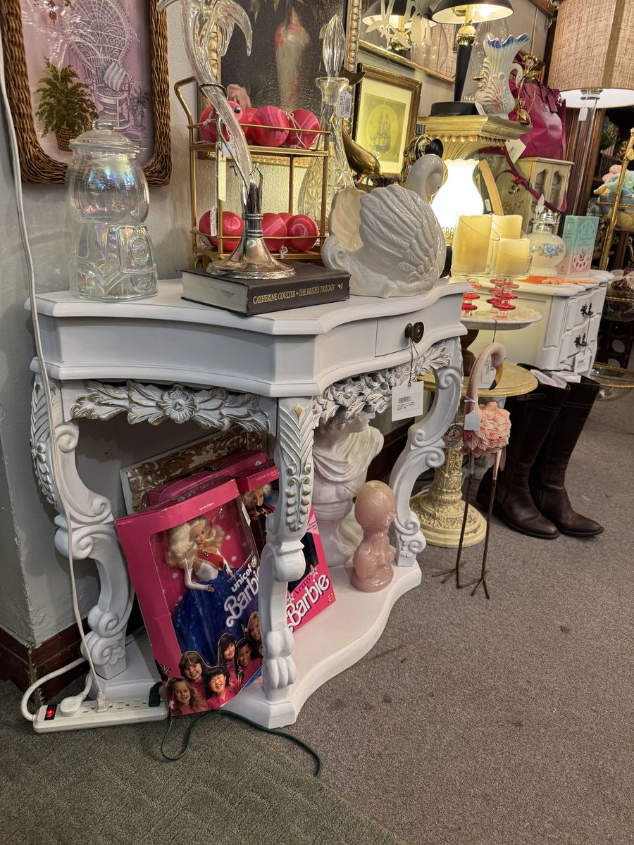GooglePayThis console will add a touch of elegance to any room. It has been refinished in a white satin color with a heavy duty top coat and beautiful gold added through the carvings to make it pop. Piece can come apart for transport.