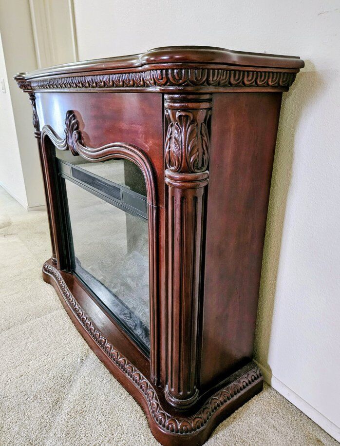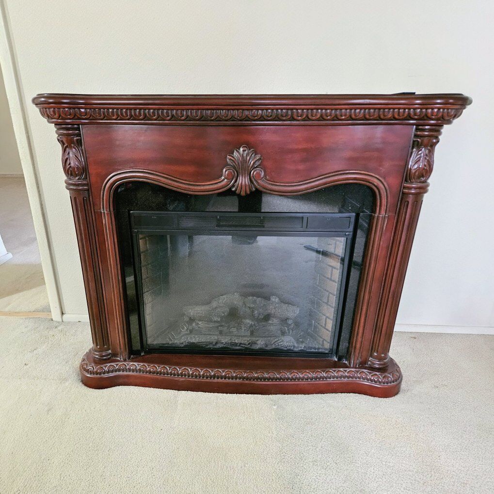 VenmoBeautiful Mahogony free-standing plug-in electric fireplace. This mantel unit features an insert with blower, adjustable thermostat, flame settings (with or without heat), and remote control, designed for cozy indoor ambiance and heating without needing venting. mantle. 3 levels of Flame, heat or both. 2007 by Twin Star. Model #33EF01GRA. Dimensions: 55" W x 17" D x 45 1/2" H Excellent condition - only a couple light scratches on top. Includes Remote control. Would look amazing in living room, bedroom or office! From smoke-free, pet-free, child-free home.