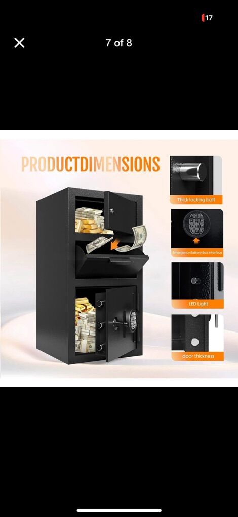 4.0 Cu Ft Large Double Door Fireproof Drop Safe for Business Heavy Duty Safe Box with Drop Slot Anti-Theft Money Drop Box with Lock and Slot Anti-Fishing for Cafe Restaurant Gas Station Product Dimensions 14D x 14W x 27.2H Lock Type Electronic Combination Lock, Key Color Black Capacity 4 Cubic Feet Material Alloy Steel [Extra Large Drop Safe Box For Business]: Product size: 14 x 14 x 27.2 inches (DxWxH). 4.0 cu ft safe provides extra large interior space for your belongings, such as bills, envelopes, cash, folders, valuables, checks, receipts, deposit slips, keys, and more. This safe is ideal for convenience stores, hotels, offices,clothing store, bars,church, gas stations, cafes, homes, car rentals, auto repair shops, and any cash business that needs to store valuables safely and conveniently [Drop Safe Box Anti-Fishing Design+Thickened Solid Steel Door] : Our safe drop box adapts a extra large Anti-fishing baffle. The deposit safe boasts a delivery port with a saw-tooth edge tilting baffle, even kids can't get their little fingers into this guy, enhancing security by preventing unauthorized access. 10mm door panel and 3 live-locking bolts (26mm diameter) that provide durable and reliable protection.Double door design gives you more choices [Two Ways To Open] - Emergency key + knob (first time use, forgotten password, low battery). - Password + handle (quick access, any number from 3 to 8 digits). Green: unlock or reminder light, yellow: wrong password, red: low battery indicator. If you enter the wrong password three times in a row, the alarm will beep for 20 seconds. Don't worry, the solution: open it with the emergency key and remove the batteries to immediately disarm the alarm (note: 4 AA alkaline batteries are not included) [Features]: LED backlight panel + mute function + 120° door opening: 1. The LED backlight panel will light up automatically to help you enter the password; 2. Press 1 to turn on the mute function to provide you with safety protection in dangerous situations; 3. The 120° extra-large opening angle is wider than the old 90° safe opening, making it more convenient to take and put items; 4. The integrated metal handle is more sturdy and durable; 5. The felt lining is soft and scratch-resistant. [Can be fixed on the wall or floor] There are four bolt holes on the back of the drop slot safe and two bolt holes on the bottom, which can better fix your safe and fully ensure the safety of your property Brand new in sealed box . Never opened or used . Pick up only cash or venmo