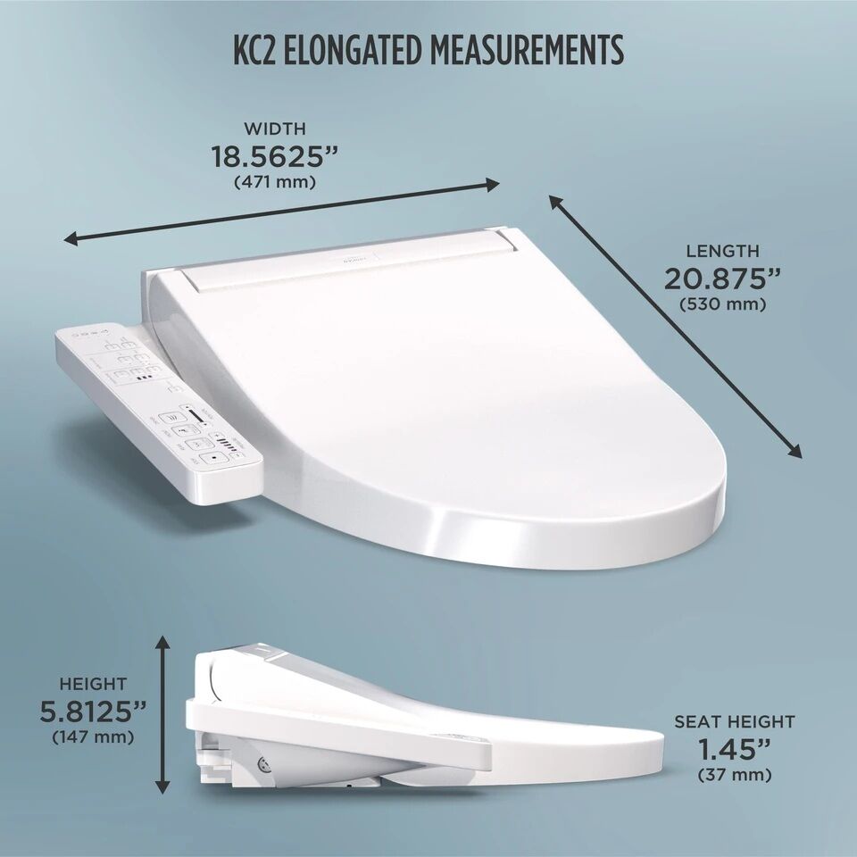 The TOTO® WASHLET® KC2 Elongated Electronic Bidet Toilet Seat is fully automated, featuring a soft rear spray, rear cleanse, and front cleanse with the option of an oscillating or pulsating stream. The KC2 includes a heated SoftClose® seat with three temperature settings. Both water temperature and water pressure are adjustable with three temperature settings and five pressure settings. The WASHLET also features a warm air dryer adding the perfect finishing touch with its three adjustable temperature settings. KC2 WASHLET provides the ultimate in personal comfort and cleanliness.