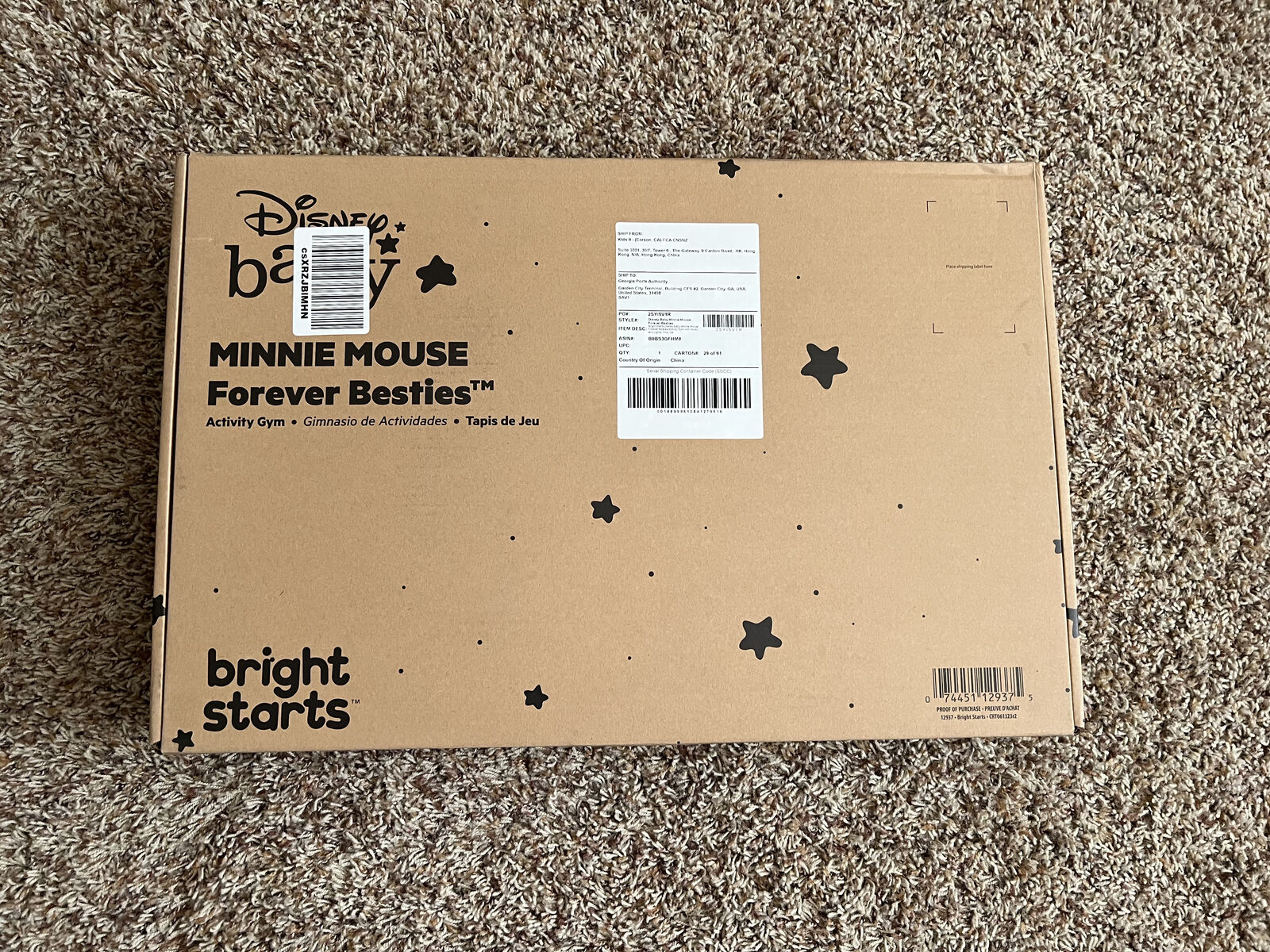 6 detachable toys include bead chaser & rattle toy, crinkle medallion, Minnie Mouse plush with chimes, textured flower toy, and musical mobile; easily move the toys around the gym or bring on the go